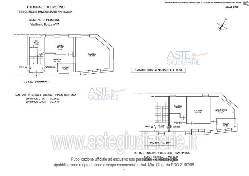 Vendita all'asta Senza incanto, con gara telematica asincrona - LOTTO 3: Appartamento di civile abitazione posto al piano terreno, composto da ingresso, cucina, camera e bagno al piano terreno e da ingresso, soggiorno con angolo cottura, due camere e bagno al piano primo. Prezzo base € 141.000,00 (offerta minima € 105.750,00). Data inizio operazioni di vendita: 30/01/2026 ore 10:00. Giudice Simona Capurso. Professionista delegato alla vendita Dott. Matteo Trumpy - Email "matteo.trumpy@studiotrumpy.eu"; Tel. 0586429398. Custode Giudiziario Istituto Vendite Giudiziarie Di Pisa - Email "prenotazionilivorno@astagiudiziaria.com". Rif. Tribunale di Livorno - Espropriazione immobiliare (cartabia) n. 116/2024