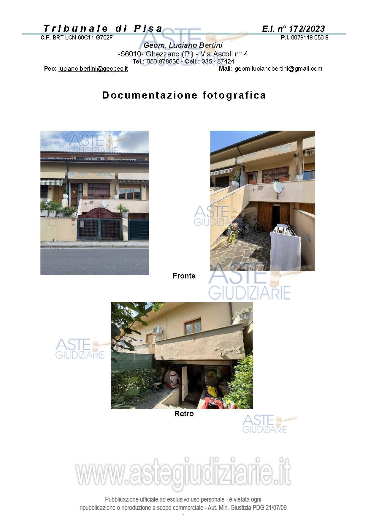 Vendita all'asta Senza incanto, con gara telematica asincrona - LOTTO UNICO: In Pisa, via Arcangelo Ghisleri numeri civici 30-32, piena proprietà di porzione terra-tetto di un maggior fabbricato del tipo a schiera, costituita da un appartamento con garage e annessi antistante e retrostante resede esclusivi. Prezzo base € 142.900,00 (offerta minima € 107.175,00). Data inizio operazioni di vendita: 11/03/2026 ore 09:30. Giudice Laura Pastacaldi. Professionista delegato alla vendita Not. Barbara Bartolini. Custode Giudiziario Cosimo Erriquez - Email "prenotazionipisa@astagiudiziaria.com". Rif. Tribunale di Pisa - Espropriazione immobiliare (cartabia) n. 172/2023