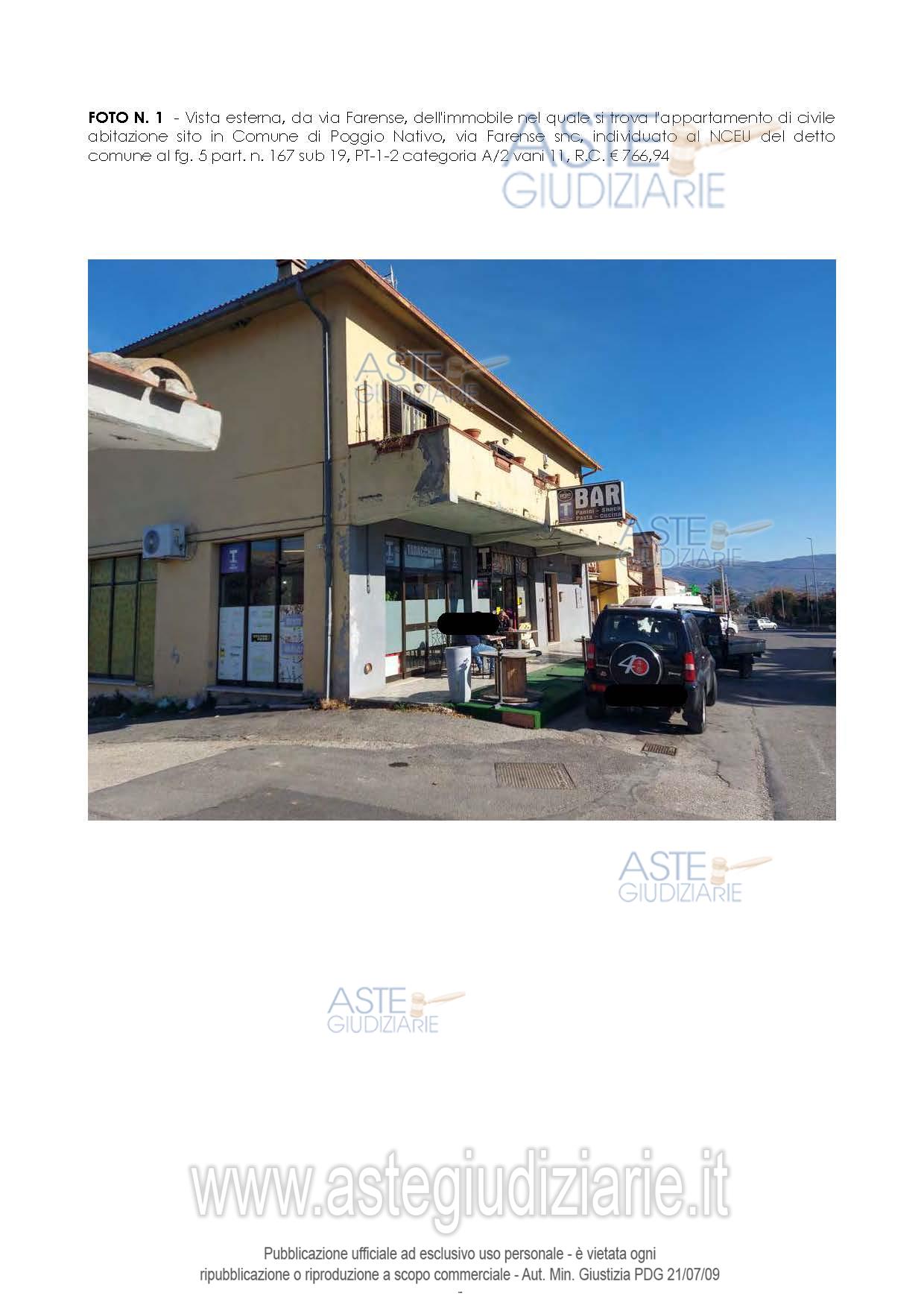 Vendita all'asta Senza incanto, con gara telematica asincrona - LOTTO 1: Ampio appartamento con accesso da distacco su via Farense, composto da ingresso al piano terra, ampio salone con cucina a vista, corridoio disimpegno, tre camere, due bagni, tre balconi al primo piano, locali sottotetto, con bagno e balcone, diritti sulla corte comune di PT part. n. 167. Prezzo base € 61.762,50 (offerta minima € 46.321,87). Data inizio operazioni di vendita: 22/12/2025 ore 10:00. Professionista delegato alla vendita Avv. Gioia Tiberti - Email "gioiatiberti@hotmail.com"; Cell. 3398868951; Tel. 0746760529. Custode Giudiziario Avv. Gioia Tiberti - Email "gioiatiberti@hotmail.com"; Cell. 3398868951; Tel. 0746760529. Rif. Tribunale di Rieti - Espropriazione immobiliare (cartabia) n. 84/2023