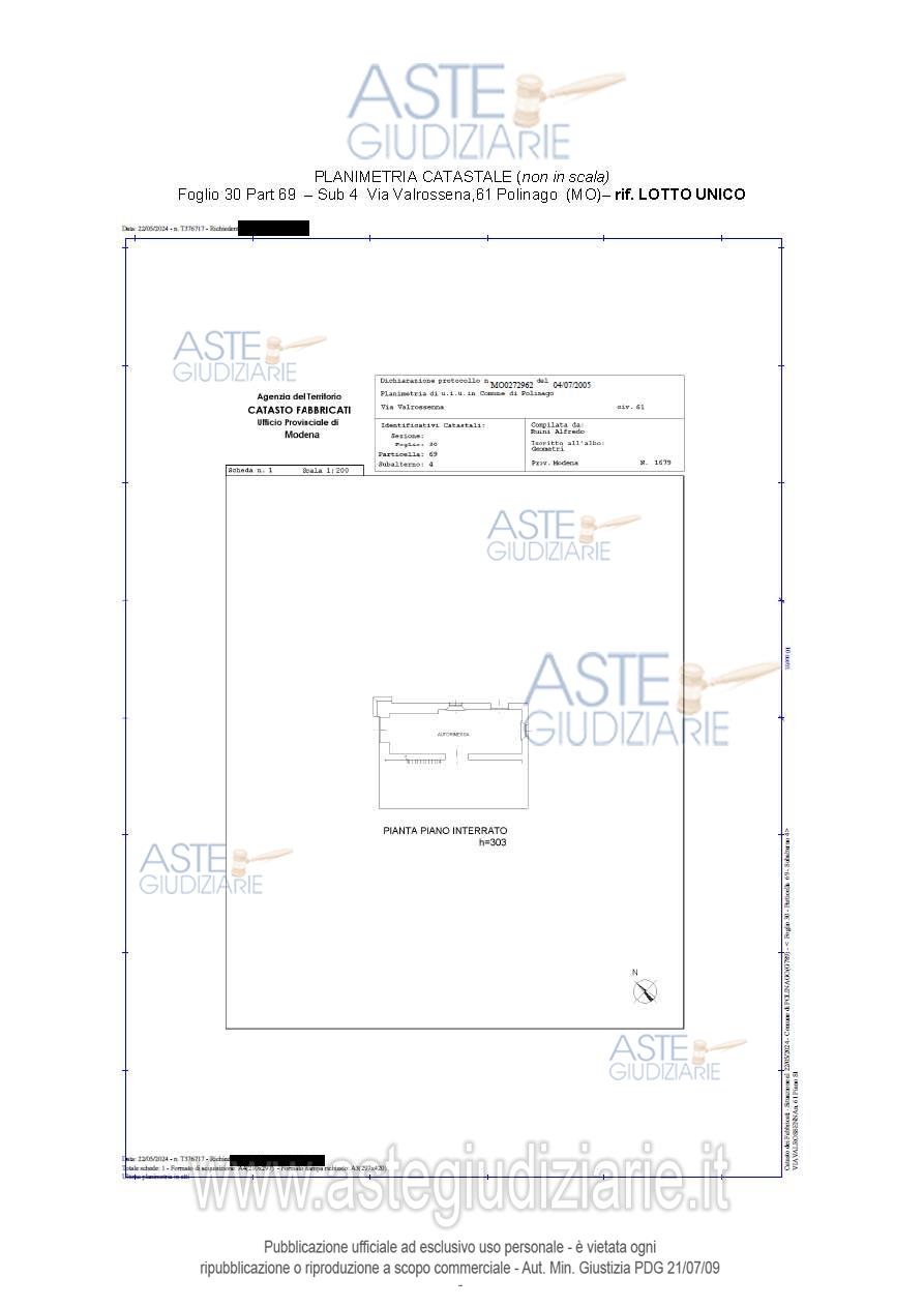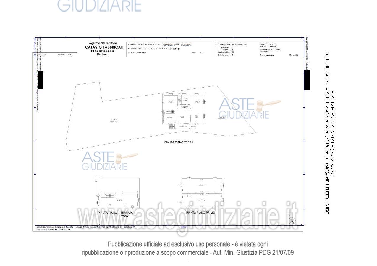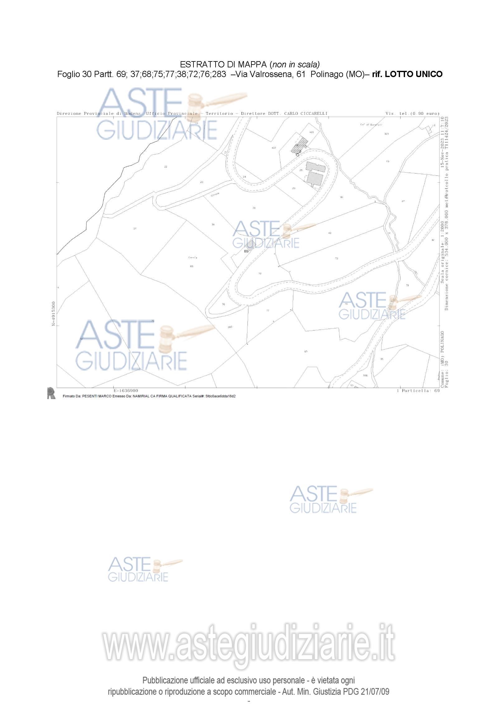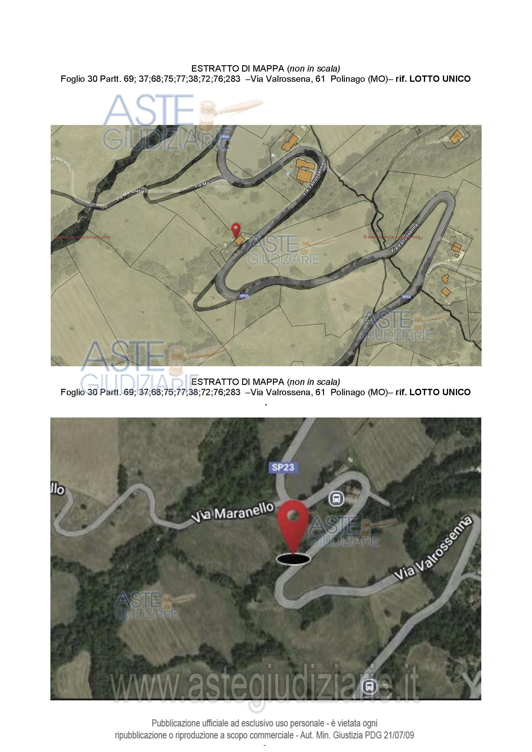 Vendita all'asta Senza incanto, con gara telematica asincrona - LOTTO UNICO: Piena proprietà di: - abitazione di tipo economico costituita da: sala – tinello, cucina, n. 3 stanze da letto, un corridoio ed un bagno a piano terra; una cantina al piano interrato; un’autorimessa al piano interrato; n. 2 soffitte comunicanti al primo piano, posta nel comune di Polinago (MO), via Valrossenna n. 61 con annessa area cortiliva; - n. 8 appezzamenti di terreno. Prezzo base € 52.000,00 (offerta minima € 39.000,00). Data inizio operazioni di vendita: 18/12/2025 ore 10:30. Professionista delegato alla vendita Avv. Elisa Caselli - Email "elisacaselli@avvocatocaselli.it"; Cell. 3335218154; Tel. 3335218154. Custode Giudiziario Alex Manelli - Email "visiteimmobili@ivgmodena.it"; Tel. 059847301. Rif. Tribunale di Modena - Espropriazione immobiliare (cartabia) n. 243/2023