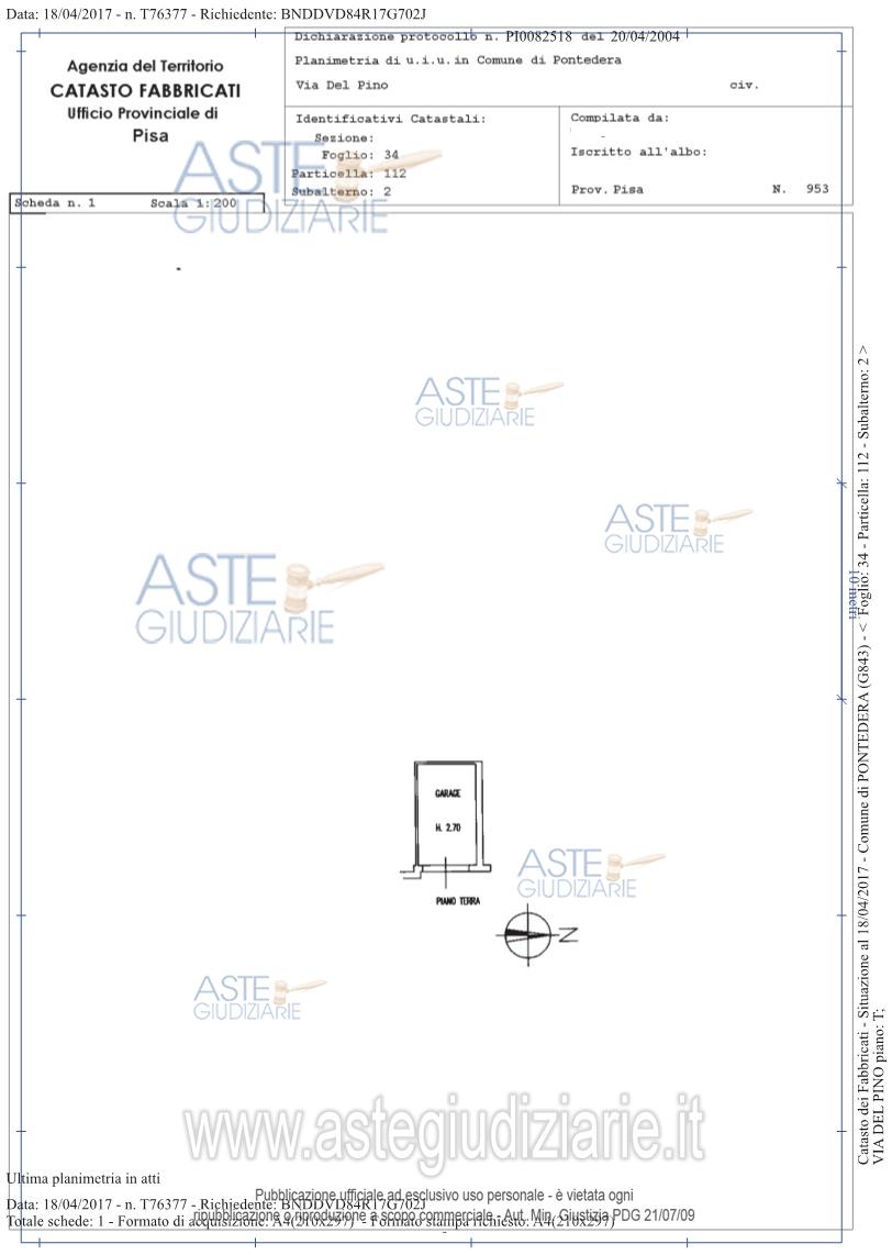 Vendita all'asta Senza incanto, con gara telematica sincrona mista - LOTTO UNICO: Appartamento e garage ubicati a Pontedera (PI) - Via del Pino n°52. Prezzo base € 140.000,00 (offerta minima € 105.000,00). Data vendita 22/01/2026 ore 15:00. Giudice Marco Zinna. Professionista delegato alla vendita Avv. Patrizia Pinto - Email "segreteria@susinipinto.com"; Tel. 05024786. Custode Giudiziario Cosimo Erriquez - Email "prenotazionipisa@astagiudiziaria.com"; Cell. 3468748140; Tel. 050554790. Rif. Tribunale di Pisa - Esecuzione immobiliare post legge 80 n. 337/2015