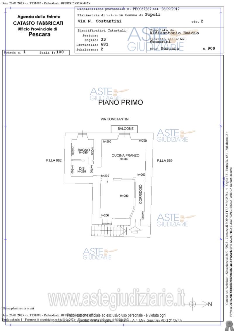 Vendita all'asta Senza incanto, con gara telematica asincrona - LOTTO 1: Appartamento sito in Popoli (PE), alla via Costantini n. 17, posto al primo piano di un fabbricato costituito da piano terra, primo e secondo piano. Prezzo base € 25.471,88 (offerta minima € 19.103,91). Data inizio operazioni di vendita: 09/06/2026 ore 11:00. Giudice Daniela Angelozzi. Professionista delegato alla vendita Avv. Guido Cappuccilli. Custode Giudiziario Avv. Guido Cappuccilli - Email "guido@studiocappuccilli.it"; Tel. 08528417. Rif. Tribunale di Pescara - Espropriazione immobiliare (cartabia) n. 181/2023