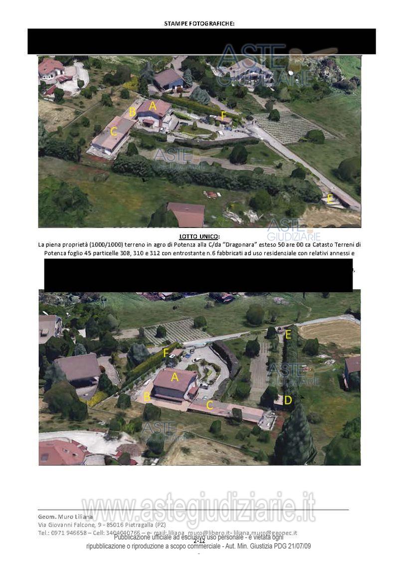 Vendita all'asta Senza incanto - LOTTO UNICO: Quota 1/1 della piena ed intera proprietà nel comune di Potenza alla c.da Dragonara, terreno con entrostanti n. 6 fabbricati ad uso residenziale riportati nel catasto fabbricati al foglio 45 p.lla 1350 sub. 1 categ. A/7 cl. 3 vani 3,5;p.lla 1350 sub. 2 categ. A/7 cl. 3 vani 5,5; p.lla 1350 sub. 3, categ. A/7 cl.3 vani 5,5; p.lla 1350 sub. 4, categ. A/7 cl. 3 vani 5,5; p.lla 1350 sub. 5, categ. C/2 cl. 6 mq. 20; p.lla 1350 sub. 6, categ. C/2 cl. 6 ma. 17. terreni foglio 45 p.lle: - 308 ;- 310- 312 . Prezzo base € 84.966,00 (offerta minima € 63.725,00). Data vendita 19/03/2026 ore 11:00. Professionista delegato alla vendita Avv. Monica Dea De Luca - Email "avv.monicadeadeluca@gmail.com"; Cell. 3385971550; Tel. 0971287426. Custode Giudiziario Avv. Monica Dea De Luca - Email "avv.monicadeadeluca@gmail.com"; Cell. 3385971550; Tel. 0971287426. Rif. Tribunale di Potenza - Esecuzione immobiliare post legge 80 n. 35/1987