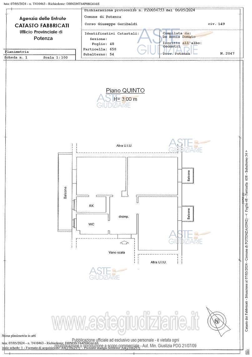 Vendita all'asta Senza incanto - LOTTO UNICO: 1000/1000 della proprietà dell’appartamento ubicato in Potenza al Corso Garibaldi, 195, piano 5, scala C di 67 mq., indicato in catasto al foglio 48 particella 658 subalterno 54 (ex subalterno 39), Categoria A/4, Classe 4, Consistenza 4 vani, Rendita € 173,53 con annessa soffitta ubicata al settimo piano indicata in catasto al foglio 48, particella 658 subalterno 55, Categoria C/2, Classe 6, Consistenza 8 mq, Rendita € 26,44. Prezzo base € 43.980,47 (offerta minima € 32.985,35). Data vendita 12/02/2026 ore 17:00. Professionista delegato alla vendita Avv. Domenico Pace - Email "pacedomenic@yahoo.it". Custode Giudiziario Avv. Domenico Pace - Email "pacedomenic@yahoo.it". Rif. Tribunale di Potenza - Esecuzione immobiliare post legge 80 n. 58/2015