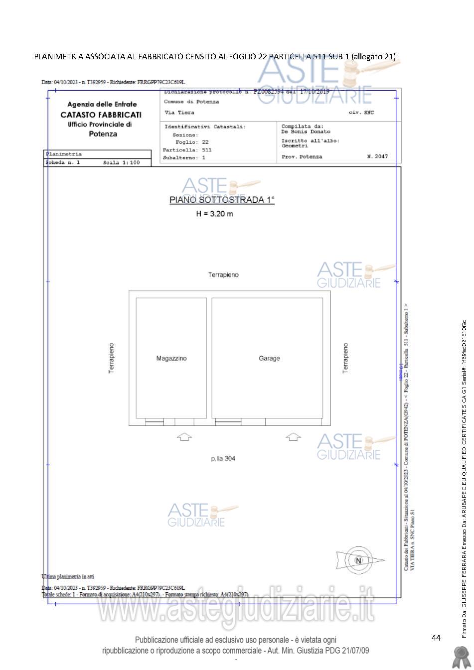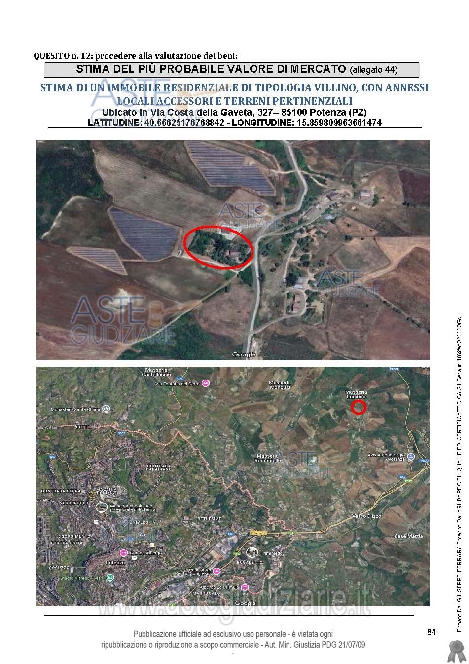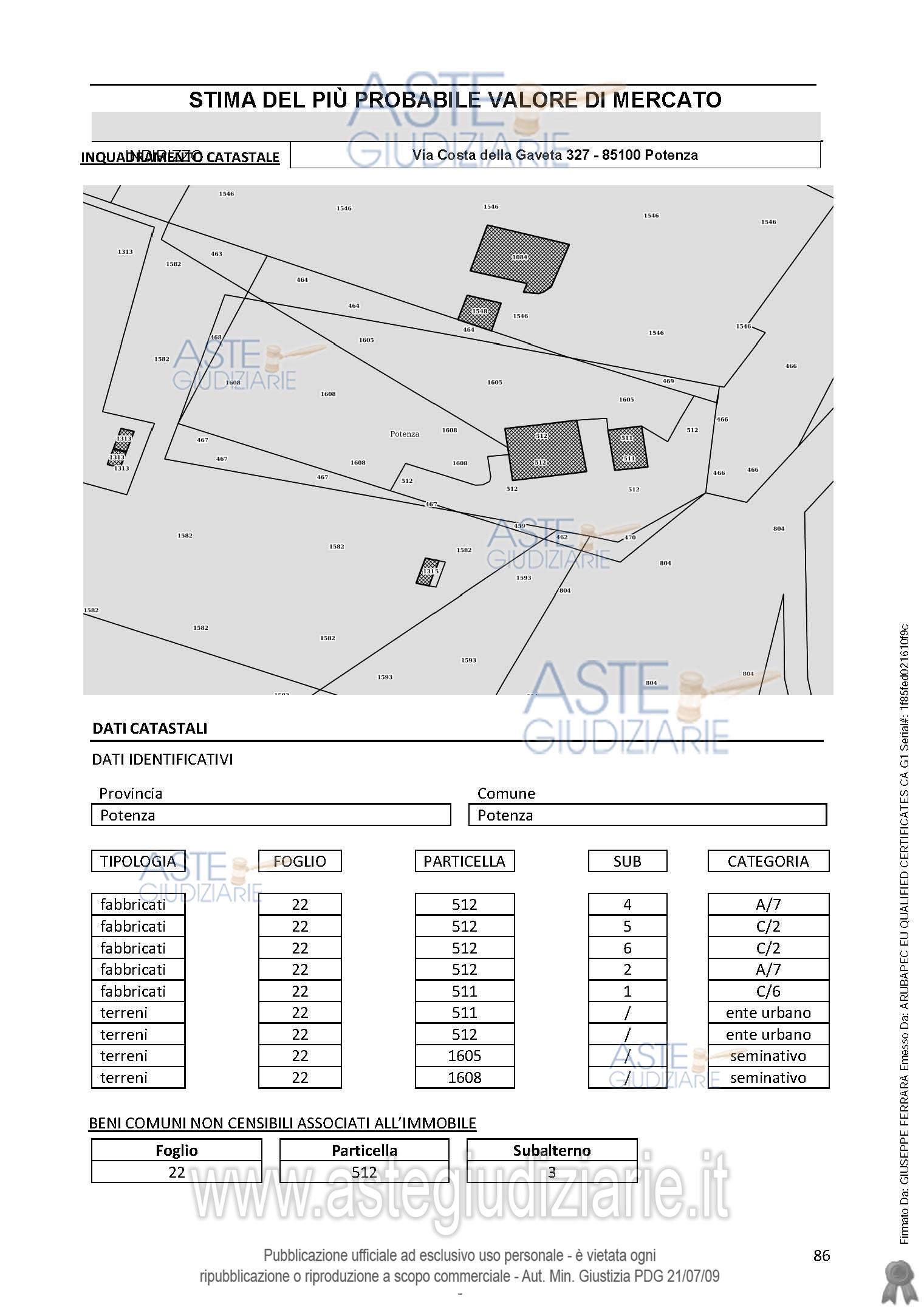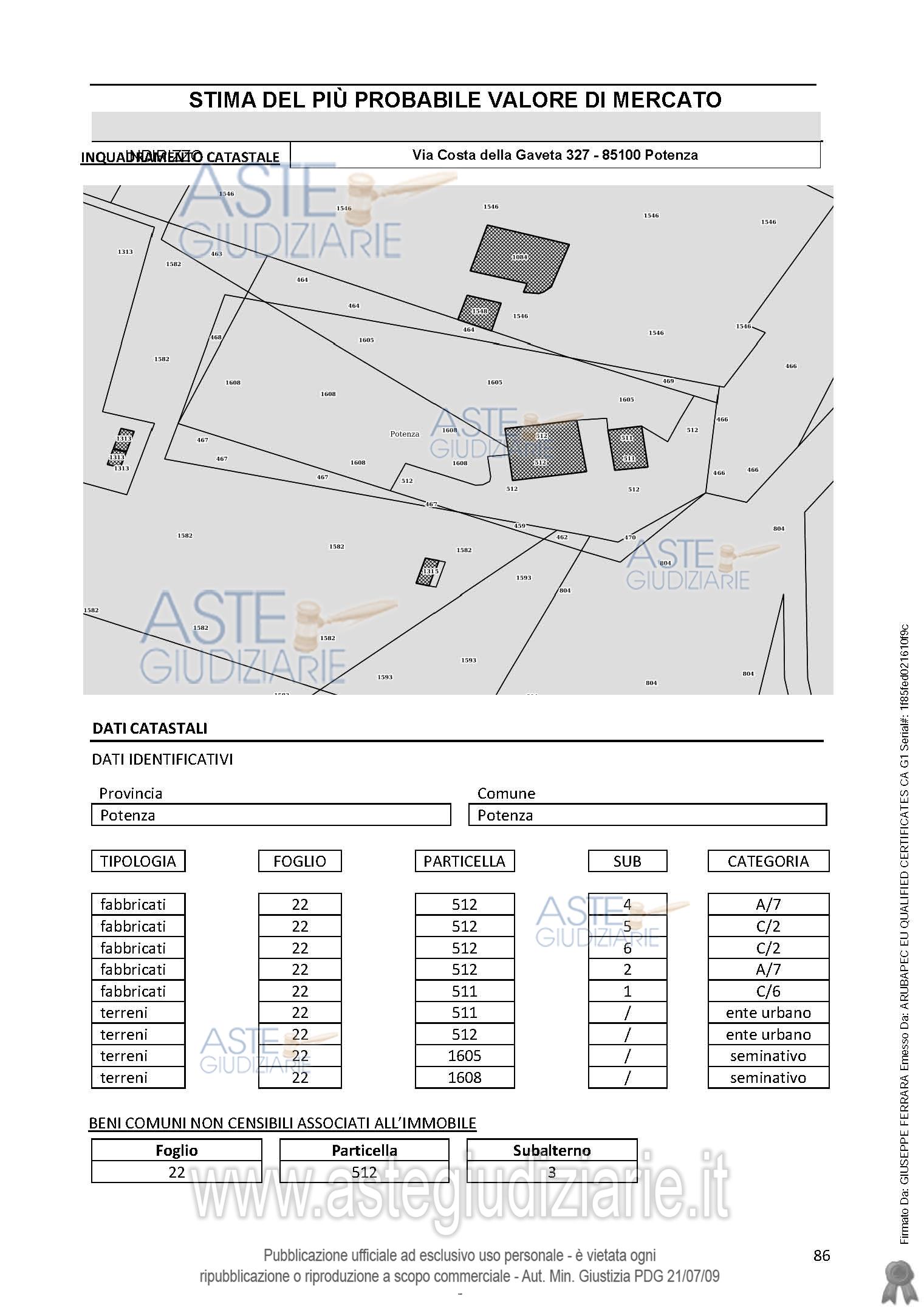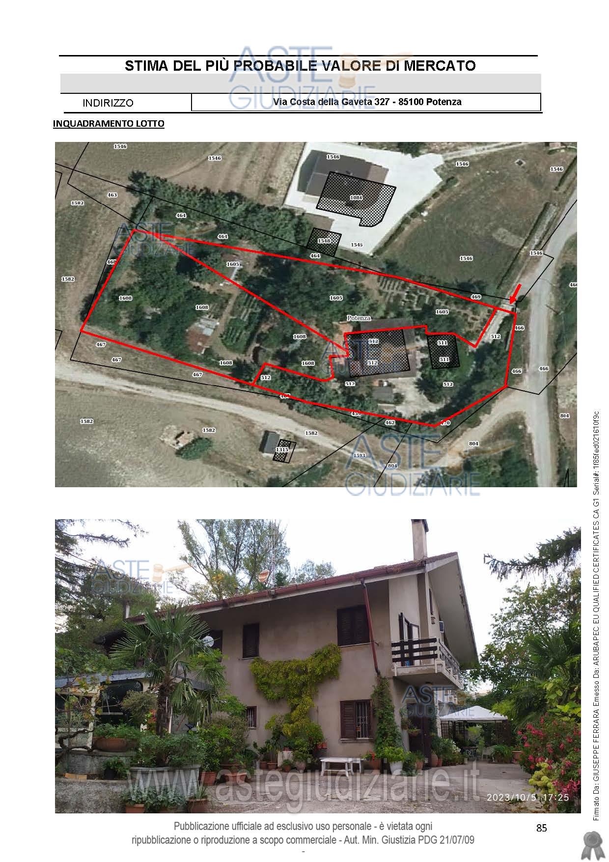 Vendita all'asta Mezzo commissionario, con gara telematica asincrona - LOTTO UNICO: Piena proprietà quota 1/1 nel Comune di Potenza alla Via Costa della Gaveta n. 327 unità immobiliare: Fabbricato Catasto Fabbricati:foglio 22 particella 512 sub. 2 categ. A/7;foglio 22 particella 512 sub. 4, categ. A/7;foglio 22 particella 512 sub. 5, categ. C/2;foglio 22 particella 512 sub. 6, categ. C/2;Garage foglio 22 particella 511 sub 1 categ. C/6.Terreni catasto terreni:- al foglio 22 particelle 1605 , 1608, 511, 512. Prezzo base € 150.893,00 (offerta minima € 113.170,00). Data inizio operazioni di vendita: 29/04/2026 ore 16:30. Professionista delegato alla vendita Avv. Antonio Casulli - Email "avv.antonio.casulli@gmail.com"; Cell. 3356647447; Tel. 0971443408. Custode Giudiziario Avv. Antonio Casulli - Email "avv.antonio.casulli@gmail.com"; Cell. 3356647447; Tel. 0971443408. Rif. Tribunale di Potenza - Esecuzione immobiliare post legge 80 n. 12/2022