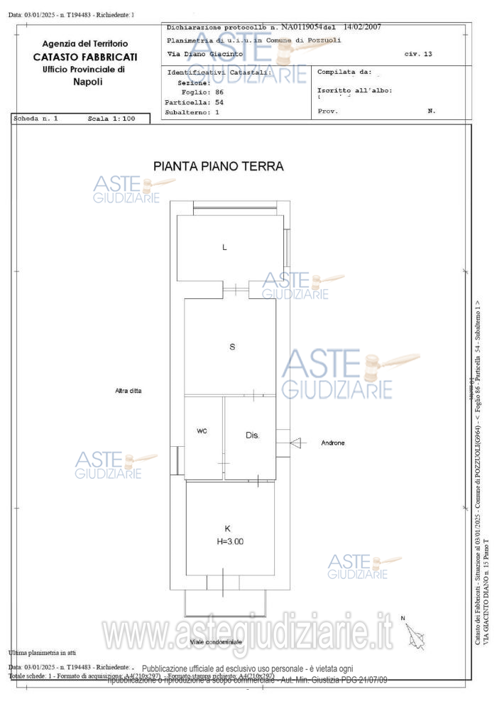Vendita all'asta Senza incanto, con gara telematica asincrona - LOTTO UNICO: Appartamento sito in Pozzuoli (Na) alla via Giacinto Diano n. 13 (catastalmente n. 15), posto al piano rialzato (catastalmente piano terra), con ingresso dalla porta in fondo a sinistra dell’androne condominiale, composto da ingresso, soggiorno, una camera, cucina e bagno. La superficie lorda commerciale è pari, arrotondata, a 71.00 mq. Prezzo base € 101.000,00 (offerta minima € 75.750,00). Data inizio operazioni di vendita: 10/06/2026 ore 10:00. Giudice Miriam Valenti. Professionista delegato alla vendita Dott. Giovanni Esposito - Email "segreteria@espositopartners.it"; Tel. 0818449234. Custode Giudiziario Dott. Giovanni Esposito - Email "segreteria@espositopartners.it"; Tel. 0818449234. Rif. Tribunale di Napoli - Espropriazione immobiliare (cartabia) n. 482/2024