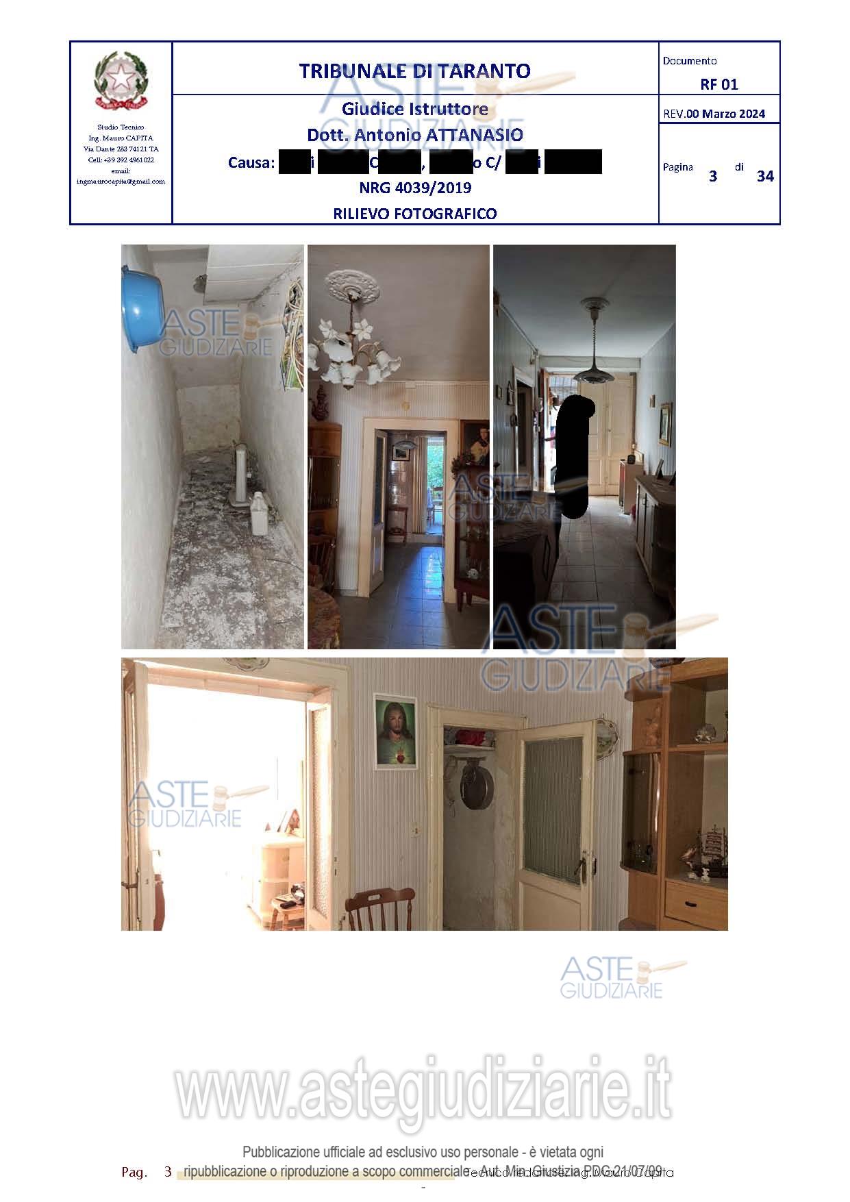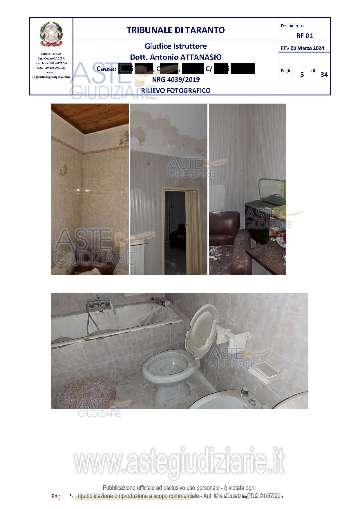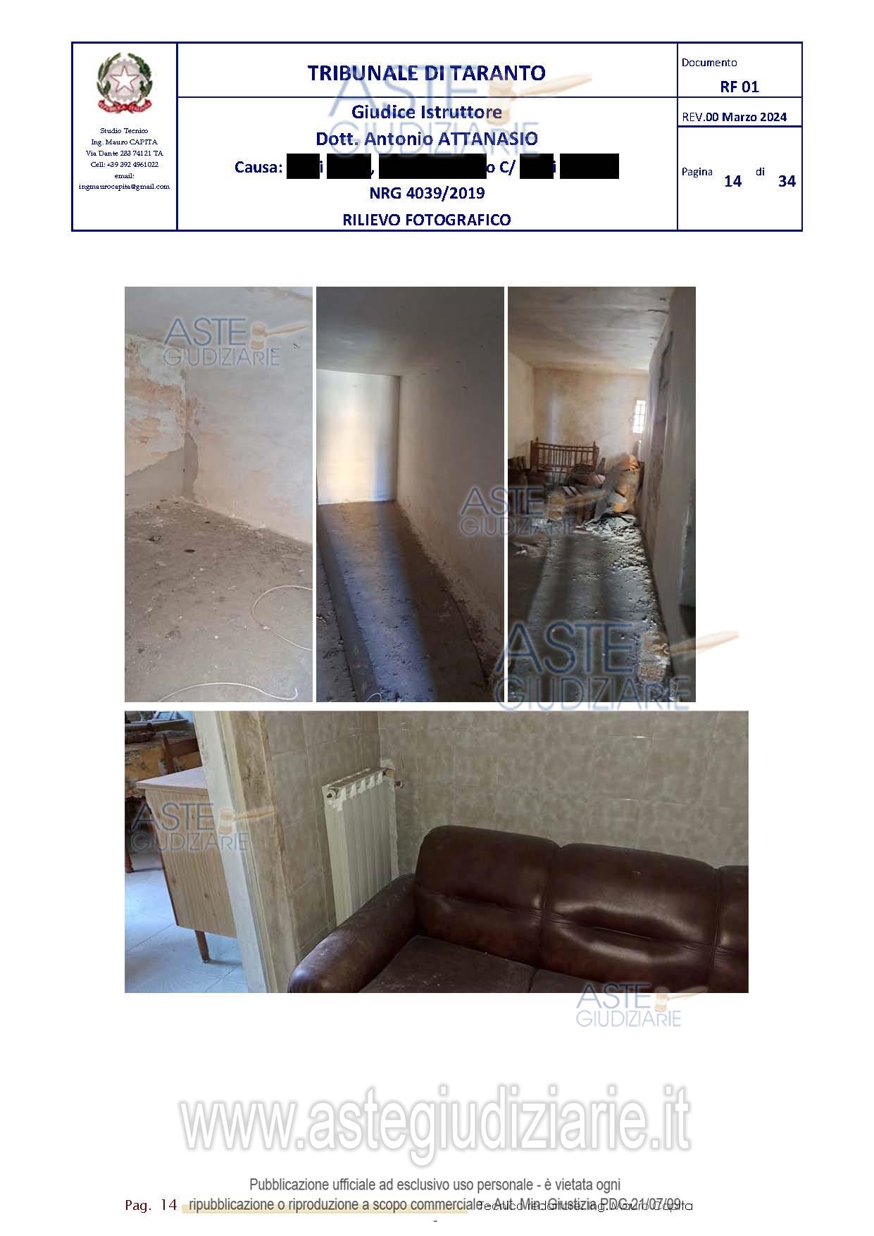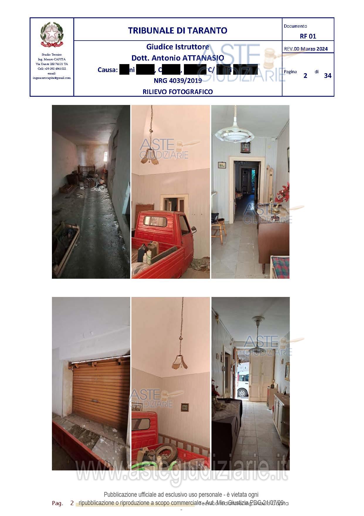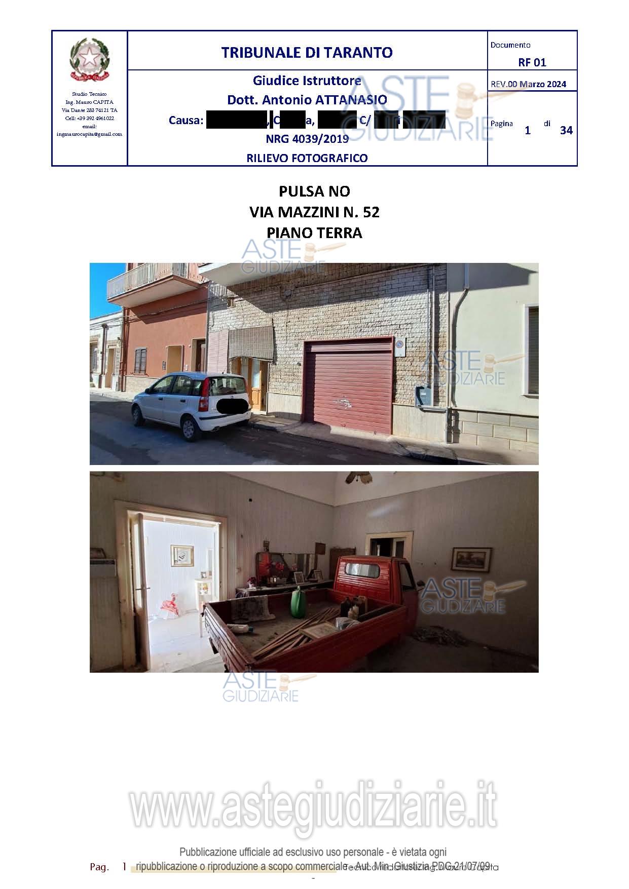 Vendita all'asta Senza incanto, con gara telematica asincrona - LOTTO 1: Piena proprietà dell’unità immobiliare sita nel Comune di PULSANO, via Mazzini n. 52, PianoTerra, della superficie lorda di 134,50 mq. Prezzo base € 53.800,00 (offerta minima € 40.350,00). Data inizio operazioni di vendita: 12/05/2026 ore 16:30. Professionista delegato alla vendita Avv. Massimo Favatà. Custode Giudiziario Avv. Massimo Favatà - Email "avv.massimofavata@gmail.com"; Tel. 0994538630. Rif. Tribunale di Taranto - Contenzioso civile n. 4039/2019