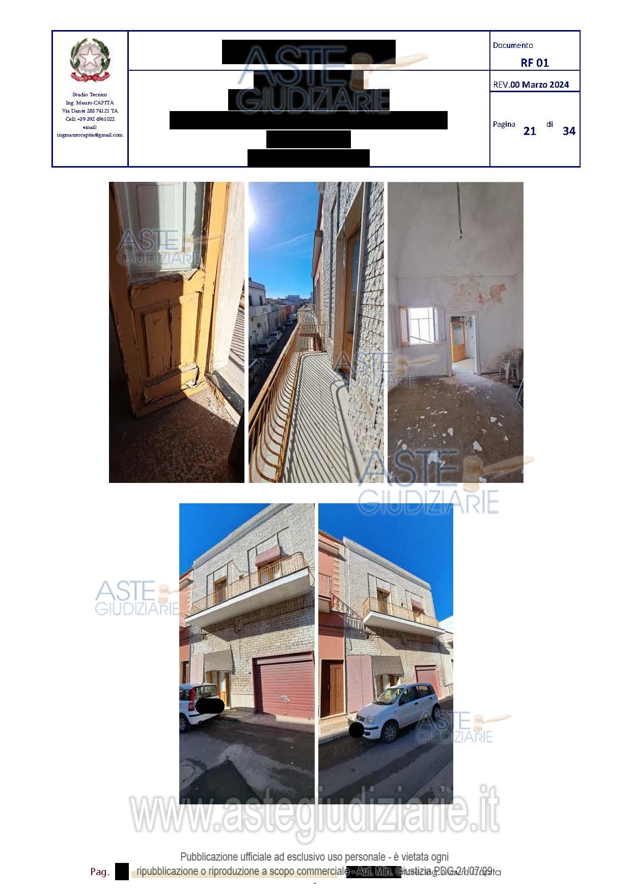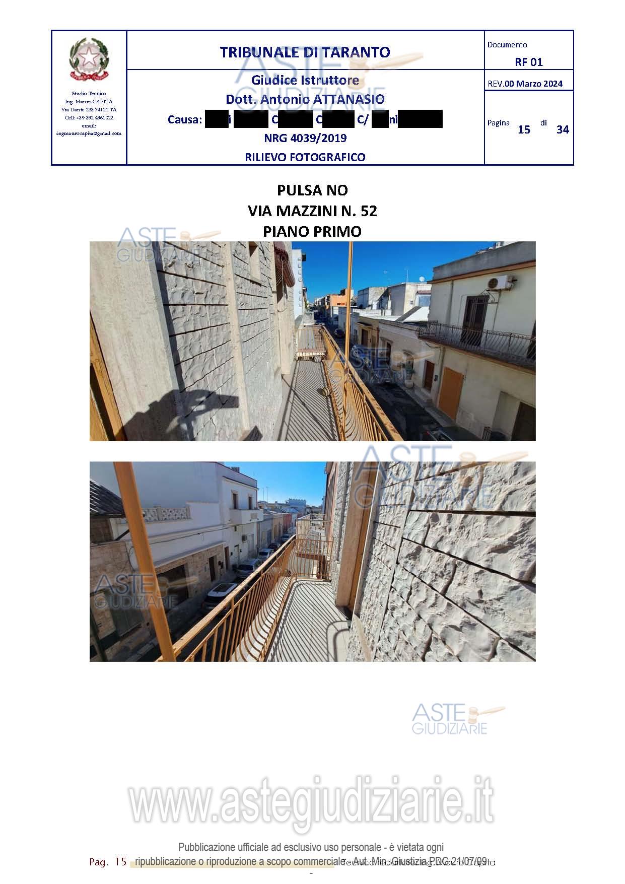 Vendita all'asta Senza incanto, con gara telematica asincrona - LOTTO 2: Piena proprietà dell’unità immobiliare sita nel Comune di PULSANO, via Mazzini n. 52, PianoPrimo, della superficie lorda di 93,05 mq. Prezzo base € 36.800,00 (offerta minima € 27.600,00). Data inizio operazioni di vendita: 12/05/2026 ore 16:30. Professionista delegato alla vendita Avv. Massimo Favatà. Custode Giudiziario Avv. Massimo Favatà - Email "avv.massimofavata@gmail.com"; Tel. 0994538630. Rif. Tribunale di Taranto - Contenzioso civile n. 4039/2019