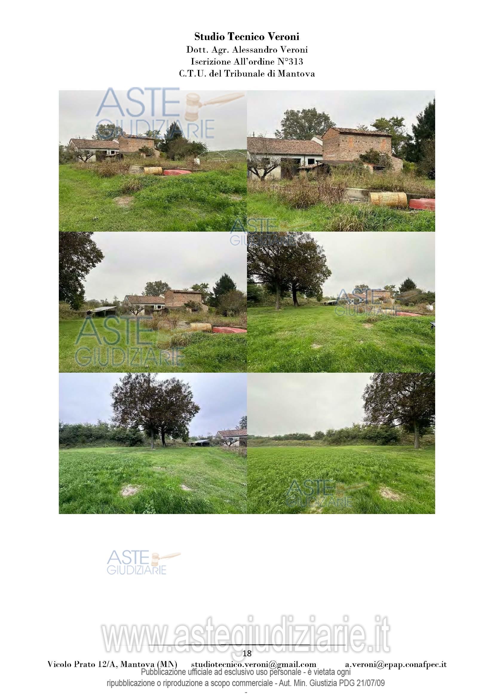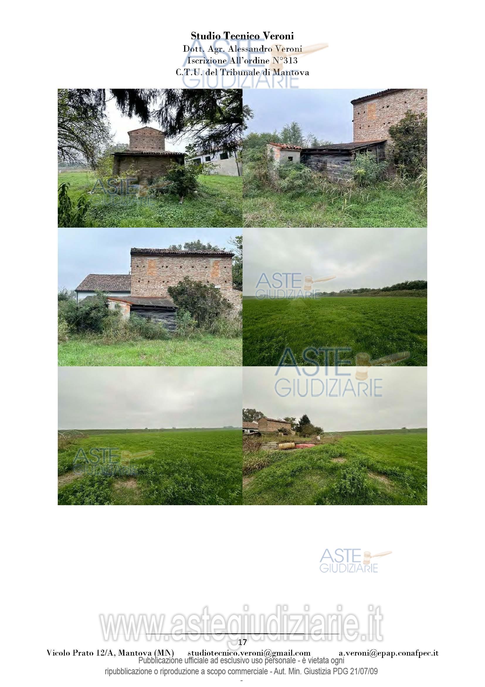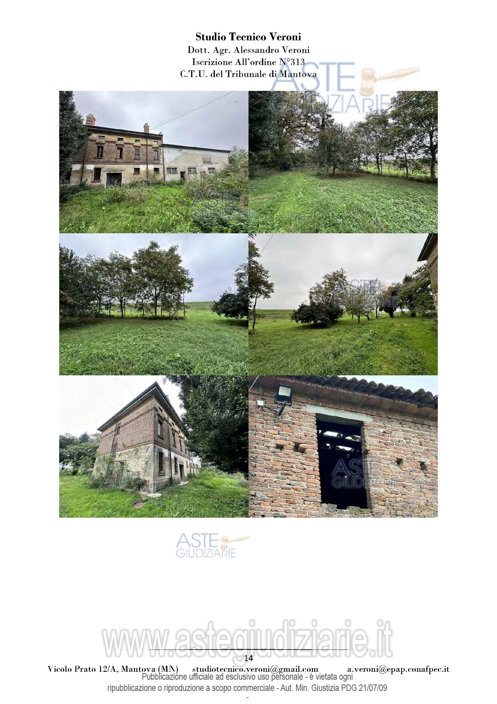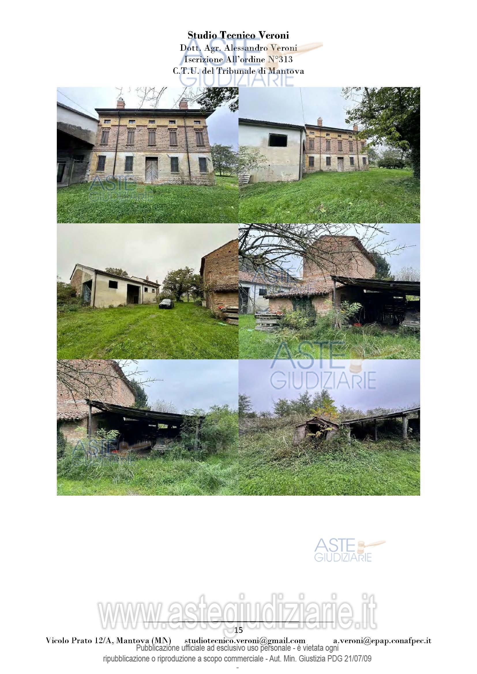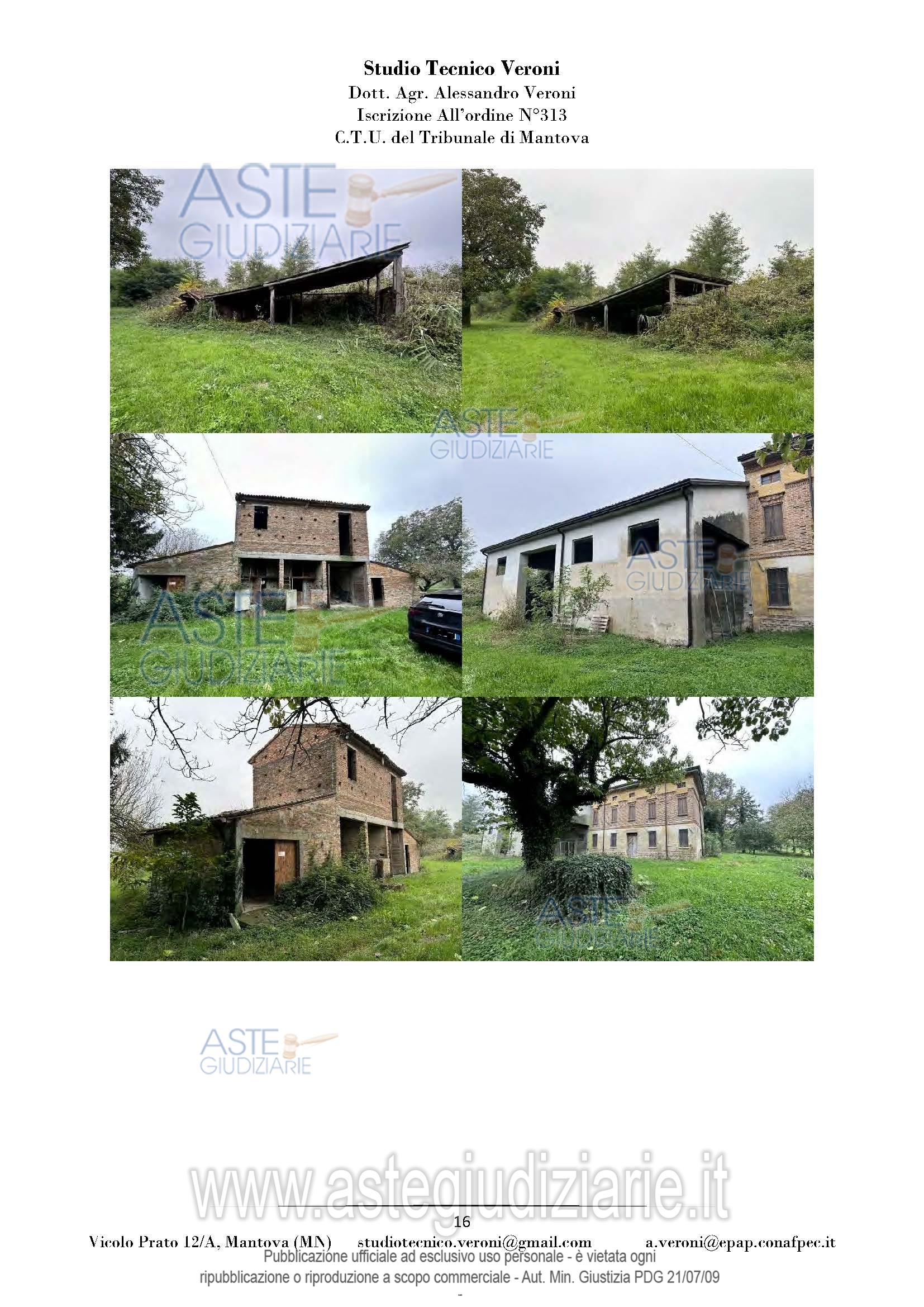 Vendita all'asta Senza incanto, con gara telematica sincrona mista - LOTTO UNICO: Piena proprietà di casa colonica dislocata su tre piani fuori terra nonché fabbricato rurale composto da cinque corpi di fabbrica, il tutto facente parte di un più amplio complesso agricolo, oltre a fabbricato rurale collabente e cinque terreni agricoli. Prezzo base € 93.713,00 (offerta minima € 70.285,00). Data vendita 01/04/2026 ore 14:30. Giudice Dott. Francesca Arrigoni. Professionista delegato alla vendita Not. Roberta Matera - Email "rmatera@notariato.it". Custode Giudiziario Sovemo Srl Istituto Vendite Giudiziarie Di Mantova - Email "immobiliaremantova@sovemo.com"; Tel. 0376220694. Rif. Tribunale di Mantova - Espropriazione immobiliare (cartabia) n. 152/2024