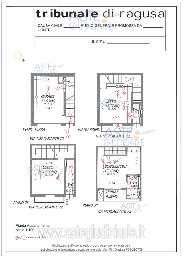 Vendita all'asta Senza incanto, con gara telematica sincrona mista - LOTTO UNICO: Diritti di piena proprietà su di un fabbricato situato all’interno del centro abitato di Ragusa, invia Mercadante n. 72a composto da:- Abitazione in catasto di Ragusa al foglio A 277 (ex 265), particella 3597 (ex 838), sub.2, cat. A/4, z.c.1, cl. 2, vani 4,5 , piano 1-2-3, R.C. € 218,46, 82 mq;- Garage in catasto di Ragusa al foglio A 277 (ex 265), particella 3597 (ex 838), sub.1, cat. C/6, z.c.1, cl. 2, Consistenza 21 mq, R.C. € 52,06. Prezzo base € 19.969,00 (offerta minima € 14.976,75). Data vendita 18/06/2026 ore 10:30. Giudice Francesco Rio. Professionista delegato alla vendita Dott. Alessandro Velardita. Custode Giudiziario Dott. Alessandro Velardita - Email "studiovelardita@gmail.com"; Tel. 09321972266. Rif. Tribunale di Ragusa - Espropriazione immobiliare (cartabia) n. 197/2024