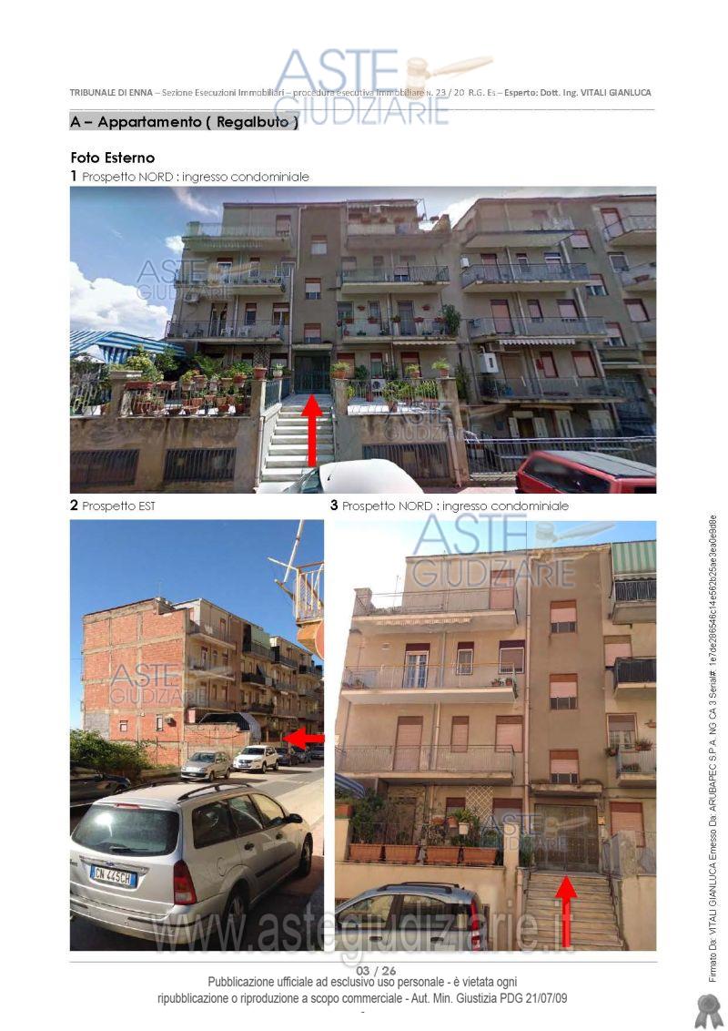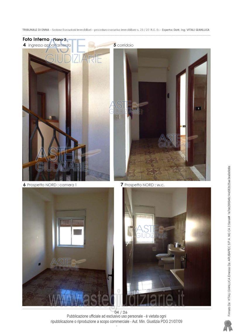 Vendita all'asta Senza incanto, con gara telematica sincrona mista - LOTTO 1: LOTTO A) APPARTAMENTO PER CIVILE ABITAZIONE di tipo economico, ubicato in zona periferica sulla S.P.23b, in catasto al Foglio 62, Part 746, Sub 7, Piano 2, Cat A3 (abitazioni di tipo economico), Classe 3, Vani 6, Superficie 118 m², Rendita €263,39. Prezzo base € 36.000,00 (offerta minima € 27.000,00). Data vendita 13/05/2026 ore 11:00. Giudice Davide Palazzo. Professionista delegato alla vendita Avv. Maria Concetta Pitronaci - Email "avv.mcpitronaci@alice.it". Custode Giudiziario Avv. Maria Concetta Pitronaci - Email "avv.mcpitronaci@alice.it"; Tel. 3923557222. Rif. Tribunale di Enna - Esecuzione immobiliare post legge 80 n. 23/2020