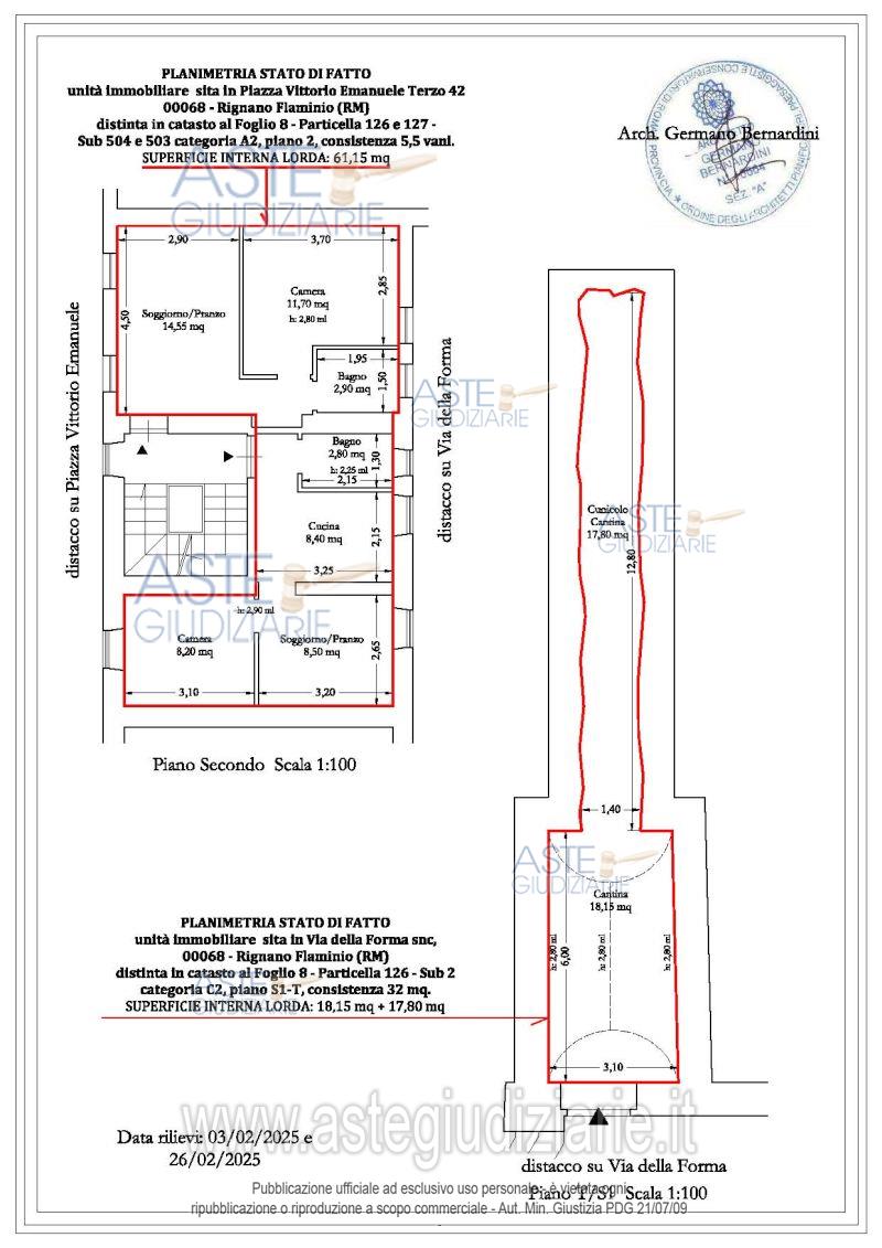 Vendita in attesa dell'emissione del nuovo bando d'asta. LOTTO UNICO: Quota pari a 1/1 diritto di proprietà appartamento in Rignano Flaminio, Piazza Vittorio Emanuele 43 piano 2°, frazionato mediante la realizzazione di un bagno e angolo cottura. Consta di due appartamenti distinti, uno con soggiorno e angolo cottura camera da letto e bagno e l’atra con cucina, soggiorno, camera da letto e bagno per complessivi mq. 63;Quota pari a 1/1 del diritto di proprietà su Cantina piano Terra/S1 di un fabbricato residenziale in Rignano Flaminio (Rm), Via della Forma snc. mq. 28. Ultimo prezzo base € 68.260,00 (offerta minima € 51.195,00). Professionista delegato alla vendita Avv. Emanuela Vergari - Email "E.VERGARI@LIBERO.IT"; Cell. 3470577962; Tel. 077485554. Custode Giudiziario Ivg Di Roma S.R.L. - Email "PVP@VISITEIVGROMA.IT"; Tel. 0689569801. Rif. Tribunale di Tivoli - Espropriazione immobiliare (cartabia) n. 345/2024