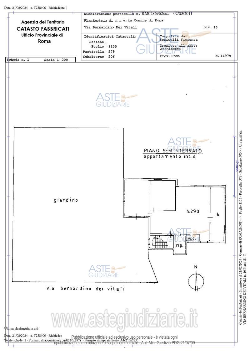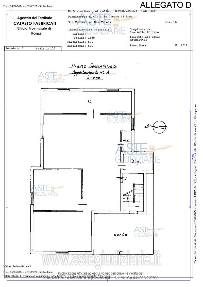 Vendita all'asta Senza incanto, con gara telematica asincrona - LOTTO 1: Quota pari ad 1/1 del diritto di piena proprietà su immobile sito in Roma (RM), Via Bernardino dei Vitali n. 16, piani T-S1, interno A. L’immobile è accatastato con categoria A/2 ma urbanisticamente ha destinazione d’uso locale autorimessa C/6. Prezzo base € 99.328,00 (offerta minima € 74.496,00). Data inizio operazioni di vendita: 25/02/2026 ore 14:00. Giudice Dott. Miriam Iappelli. Professionista delegato alla vendita Avv. Massimiliano Catapano. Custode Giudiziario Ivg Di Roma Srl - Email "pvp@visiteivgroma.it"; Tel. 0689569801. Rif. Tribunale di Roma - Esecuzione immobiliare post legge 80 n. 335/2022