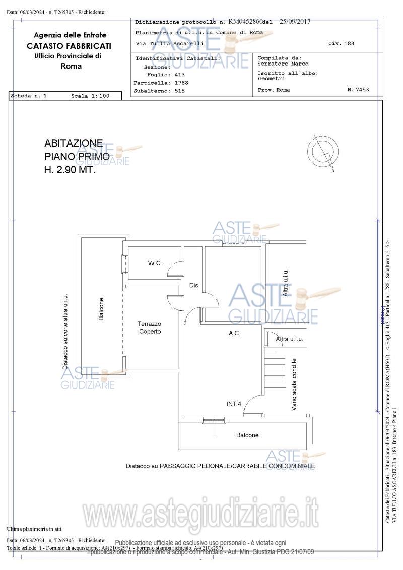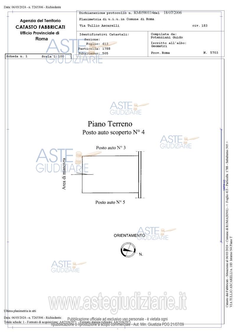 Vendita all'asta Senza incanto, con gara telematica asincrona - LOTTO UNICO: quota pari a 1/1 del diritto di piena proprietà sull'appartamento sito in Roma via Tullio Ascarelli 183 int. 4 piano primo. Prezzo base € 41.600,00 (offerta minima € 31.200,00). Data inizio operazioni di vendita: 04/06/2026 ore 10:00. Giudice Dott. Giuseppe Lauropoli. Professionista delegato alla vendita Avv. Alessia Giordano. Custode Giudiziario Ivg Di Roma Srl - Email "immobiliare@ivgroma.it"; Tel. 0683751500. Rif. Tribunale di Roma - Espropriazione immobiliare (cartabia) n. 1027/2023