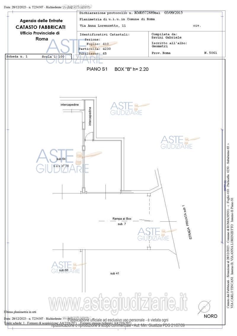 Vendita all'asta Senza incanto, con gara telematica asincrona - LOTTO 20: Porzione immobiliare facente parte del fabbricato sito in Roma, Località Massimina, con accessi carrabili da Via Carlo Tincani n. 30 e da Via Anna Lorenzetto n. 11, e precisamente:- box auto sito nell’autorimessa al piano interrato, distinto con la lettera “B”, con intercapedini, della consistenza catastale di mq 14, censito nel Catasto Fabbricati del Comune di Roma al fg 410, part. 4230, sub. 65, z.c. 6, cat. C/6, cl. 12, cons. mq 14, superficie catastale totale mq 18, Rendita Catastale Euro 56,40. Prezzo base € 11.200,00 (offerta minima € 8.400,00). Data inizio operazioni di vendita: 23/10/2025 ore 14:00. Giudice Dott. Raffaele Russo. Professionista delegato alla vendita Not. Elisa Puglielli. Custode Giudiziario Ivg Di Roma Srl - Email "pvp@visiteivgroma.it"; Tel. 0689569801. Rif. Tribunale di Roma - Esecuzione immobiliare post legge 80 n. 165/2023