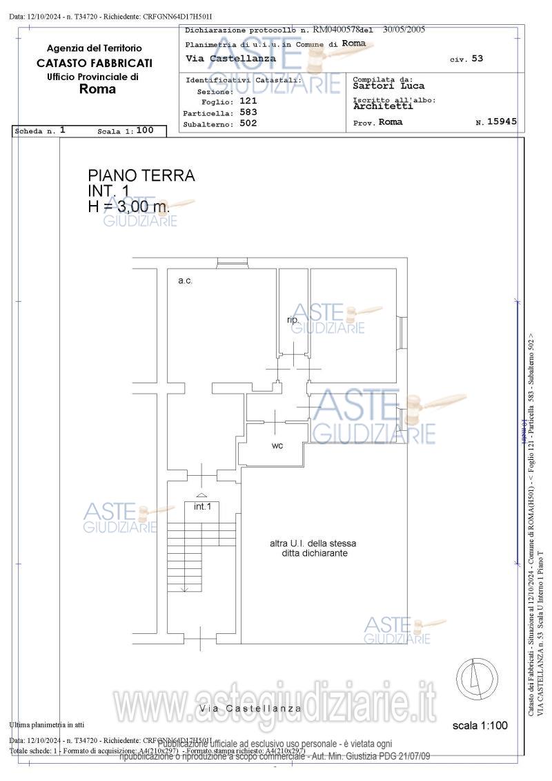 Vendita all'asta Senza incanto, con gara telematica asincrona - LOTTO UNICO: Quota pari a 1/1 del diritto di piena proprietà di appartamento per civile abitazione sito in Roma (RM) località Labaro - Via Castellanza n. 53, sc. U, int. 1, p. T, composto da ingresso, soggiorno, cucina, corridoio, due camere, ripostiglio, bagno, con annessa area giardinata pertinenziale e locale cantina, per una superficie convenzionale complessiva di 94,26 mq. Prezzo base € 107.200,00 (offerta minima € 80.400,00). Data inizio operazioni di vendita: 10/12/2025 ore 14:00. Giudice Dott. Miriam Iappelli. Professionista delegato alla vendita Avv. Maria Gualtieri. Custode Giudiziario Ivg Di Roma - Email "pvp@visiteivgroma.it"; Tel. 0689569801. Rif. Tribunale di Roma - Esecuzione immobiliare post legge 80 n. 461/2022