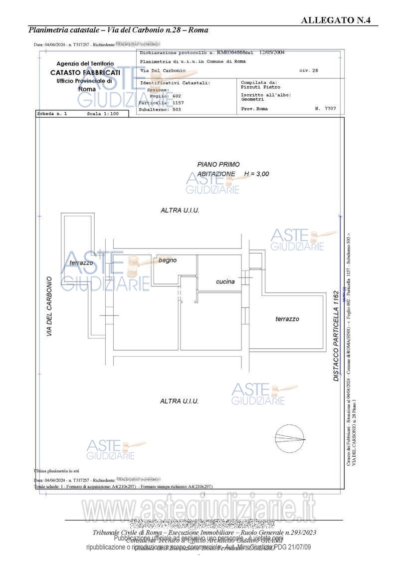 Vendita all'asta Senza incanto, con gara telematica asincrona - LOTTO UNICO: Unità immobiliare sita in Roma, via del Carbonio n. 28, piano 1° catastalmente individuata come A/3 – appartamento posto al 1° piano, composto da: terrazzo d’accesso, soggiorno, cucina, disimpegno, camera da letto, bagno, terrazzino retro con piccolo ripostiglio. La superficie commerciale complessiva è di mq. 65,58. Dati catastali: Identificato al catasto Fabbricati - Fg. 602, Part. 1157, Sub. 503, Zc. 5, Categoria A3, consistenza vani 4, r.c. Euro 754,03. Prezzo base € 112.000,00 (offerta minima € 84.000,00). Data inizio operazioni di vendita: 26/05/2026 ore 10:00. Giudice Scolaro. Professionista delegato alla vendita Avv. Maria Cristiana De Gregorio. Custode Giudiziario Ivg Di Roma Srl - Email "PVP@VISITEIVGROMA.IT"; Tel. 0689569801. Rif. Tribunale di Roma - Esecuzione immobiliare post legge 80 n. 293/2023