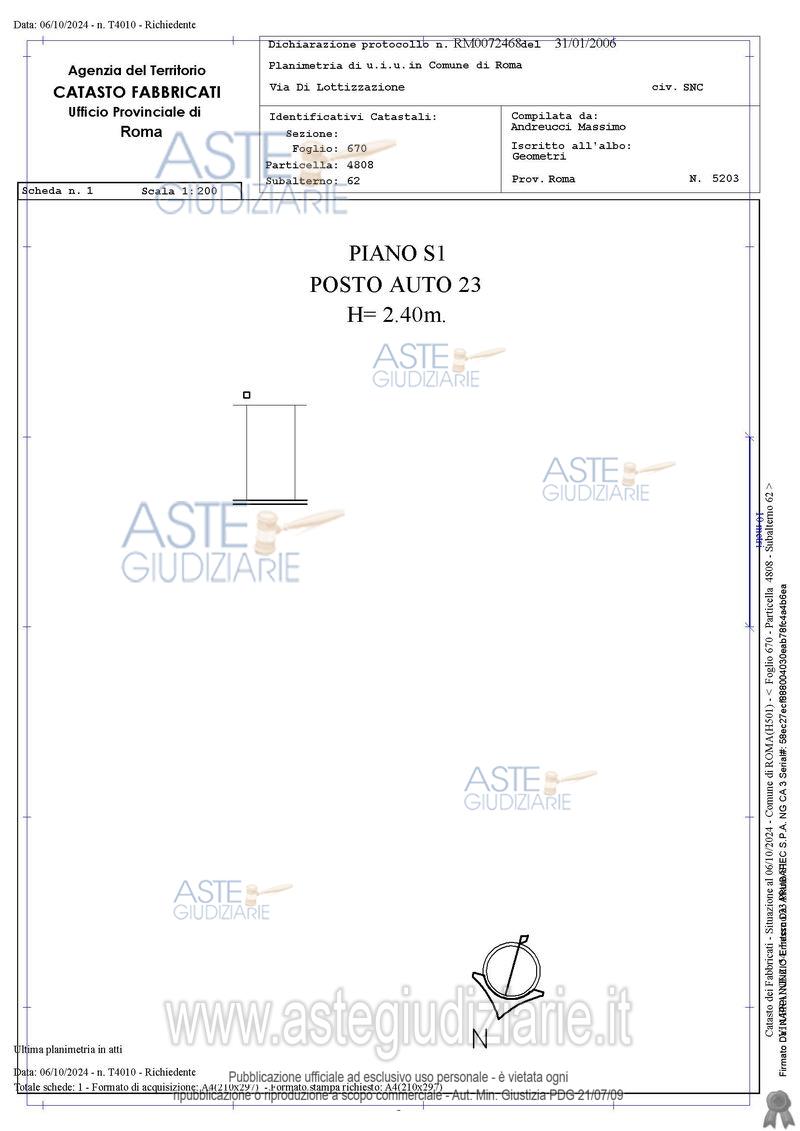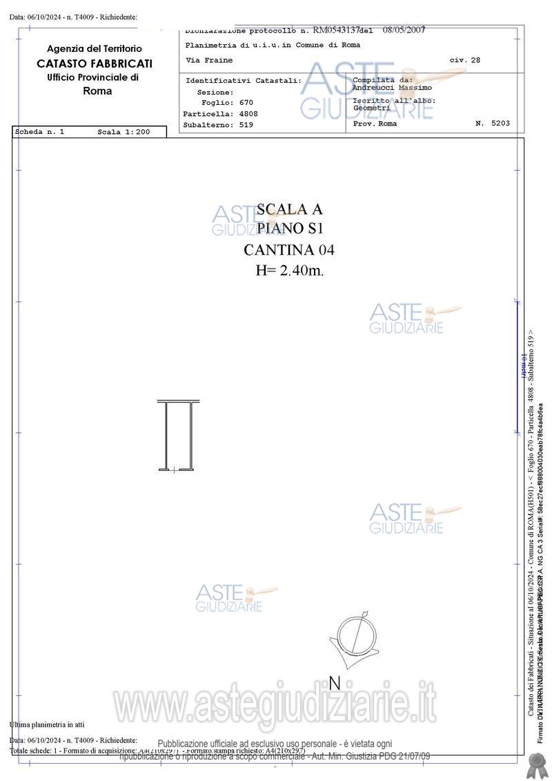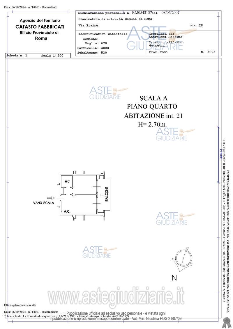 Vendita all'asta Senza incanto, con gara telematica asincrona - LOTTO UNICO: Piena proprietà di appartamento sito in Roma, Via Fraine, n. 28, scala A, interno 21, piano 4, composto da: ingresso-soggiorno con angolo cottura, piccolo disimpegno, camera, bagno e balcone. Soffitta sita in Roma, Via Fraine, 28, scala A, interno 2, piano 5. Cantina sita in Roma, Via Fraine, 28, scala A, interno 4, piano S1. Posto auto sito in Roma, Via Fraine, 54, interno 23, piano S1. Occupato dalla parte esecutata, non sarà emesso l'ordine di liberazione prima del decreto di trasferimento. Prezzo base € 103.000,00 (offerta minima € 77.250,00). Data inizio operazioni di vendita: 27/11/2025 ore 15:00. Giudice Dott. Giuseppe Lauropoli. Professionista delegato alla vendita Avv. Andrea Ordine. Custode Giudiziario Ivg Di Roma Srl - Email "pvp@visiteivgroma.it"; Tel. 0683751500. Rif. Tribunale di Roma - Espropriazione immobiliare (cartabia) n. 259/2024