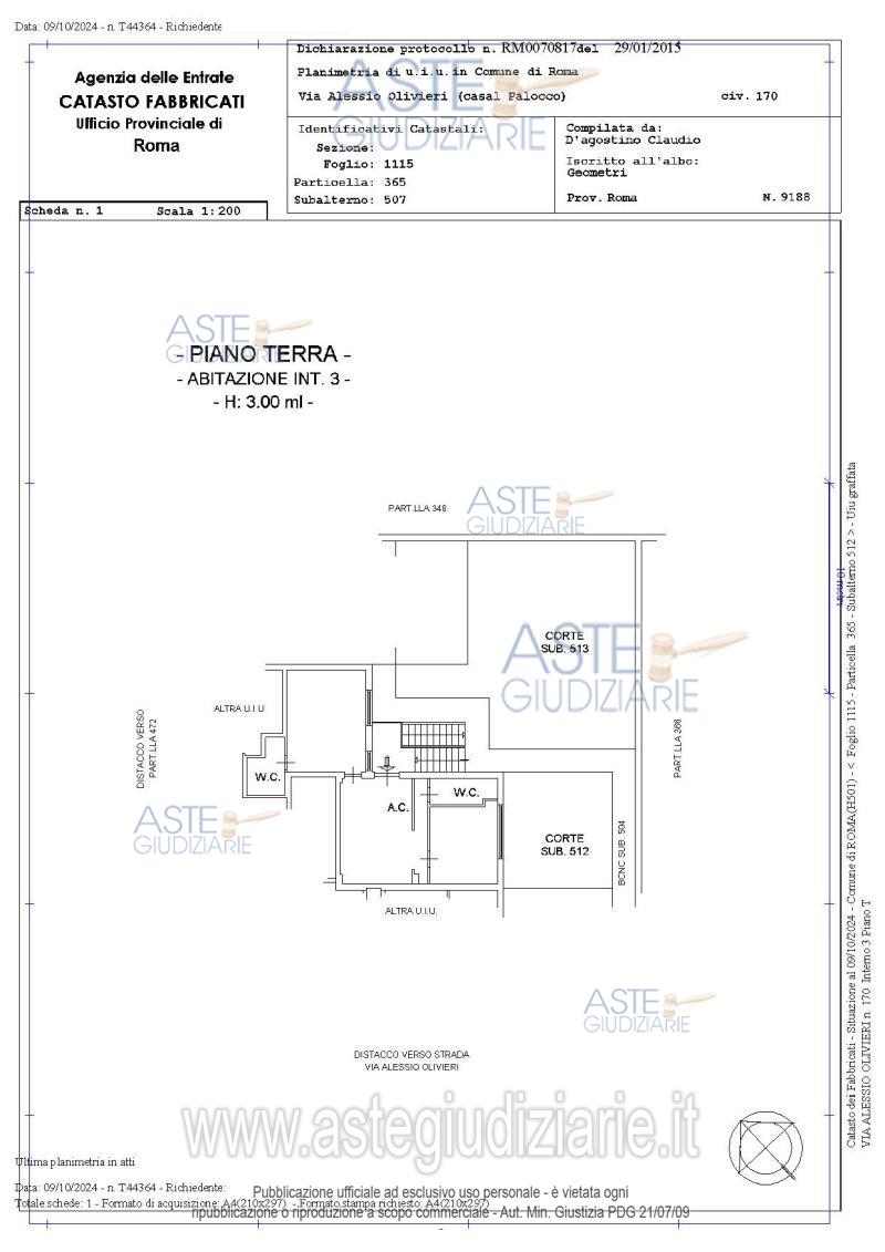 Vendita all'asta Senza incanto, con gara telematica asincrona - LOTTO UNICO: Quota pari a 1/1 del diritto di piena proprietà su appartamento sito in Roma – Via Alessio Olivieri n. 170, piano T, composto da due camere da letto, due bagni, un soggiorno con angolo cottura e giardino, per complessivi mq. 76,62.Identificato al Catasto Fabbricati del Comune di Roma al foglio n. 1115, part. 365, sub. 507, graffato 512-513.Confina con le particelle catastali nn. 366 e 368 e la scala di accesso, salvo altri. Prezzo base € 137.916,00 (offerta minima € 103.437,00). Data inizio operazioni di vendita: 14/01/2026 ore 10:00. Giudice Dott. Giuseppe Lauropoli. Professionista delegato alla vendita Dott. Gabriele Felici. Custode Giudiziario I.V.G Di Roma S.R.L. Istituto Vendite Giudiziarie - Email "pubblicita@ivgroma.it"; Tel. 06 83751500. Rif. Tribunale di Roma - Espropriazione immobiliare (cartabia) n. 1266/2023