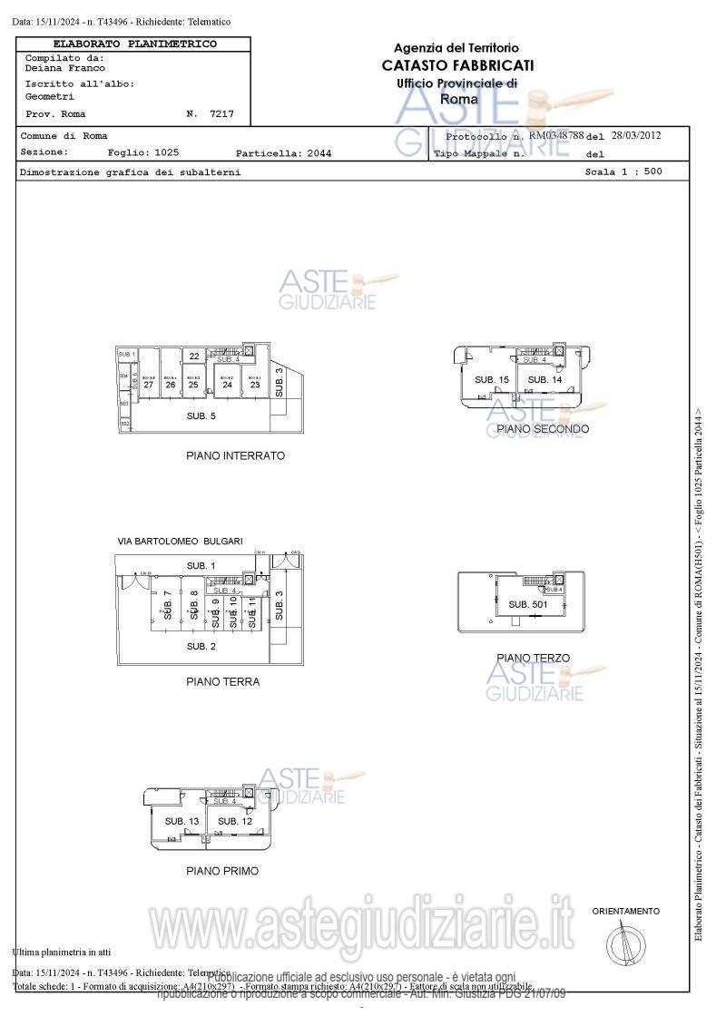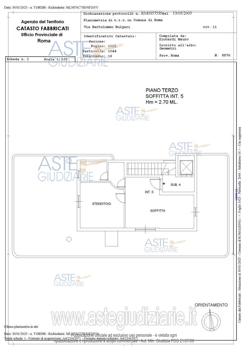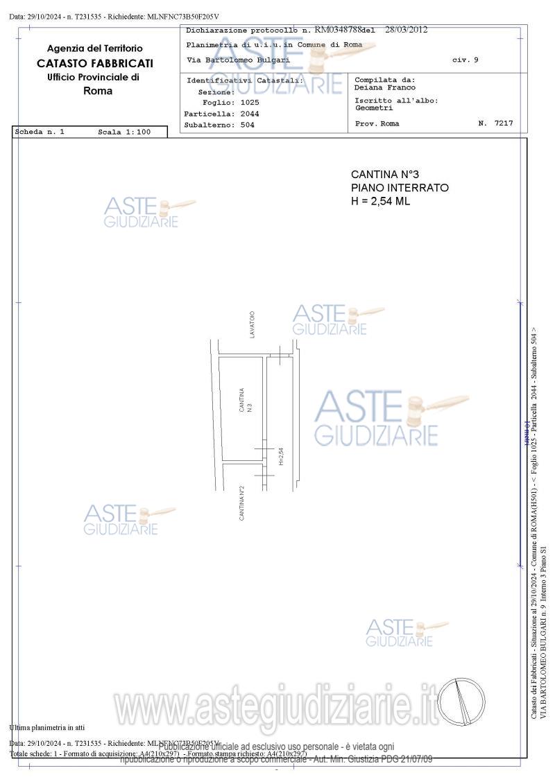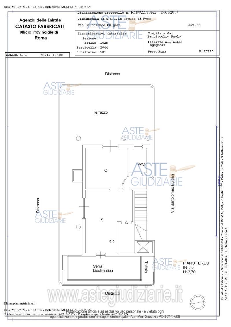 Vendita all'asta Senza incanto, con gara telematica asincrona - LOTTO UNICO: Quota pari a 100/100 del diritto di piena proprietà di: 1) appartamento sito in Roma, Via Bartolomeo Bulgari 11, int. 5, piano 3, composto da ingresso con soggiorno e angolo cottura, camera, servizi e disimpegno, con grande terrazzo su tre lati su uno dei quali è stata realizzata una serra bioclimatica2) posto auto sito in Roma, Via Bartolomeo Bulgari 13, int. 2, piano T3) cantina sita in Roma, Via Bartolomeo Bulgari 11, int. 2, piano S14) cantina sita in Roma, Via Bartolomeo Bulgari 11, int. 3, piano S1. Prezzo base € 144.800,00 (offerta minima € 108.600,00). Data inizio operazioni di vendita: 10/03/2026 ore 14:00. Giudice Dott. Miriam Iappelli. Professionista delegato alla vendita Dott. Roberto Carisi. Custode Giudiziario Ivg Di Roma Srl - Email "pvp@visiteivgroma.it"; Tel. 0683751500. Rif. Tribunale di Roma - Espropriazione immobiliare (cartabia) n. 959/2023