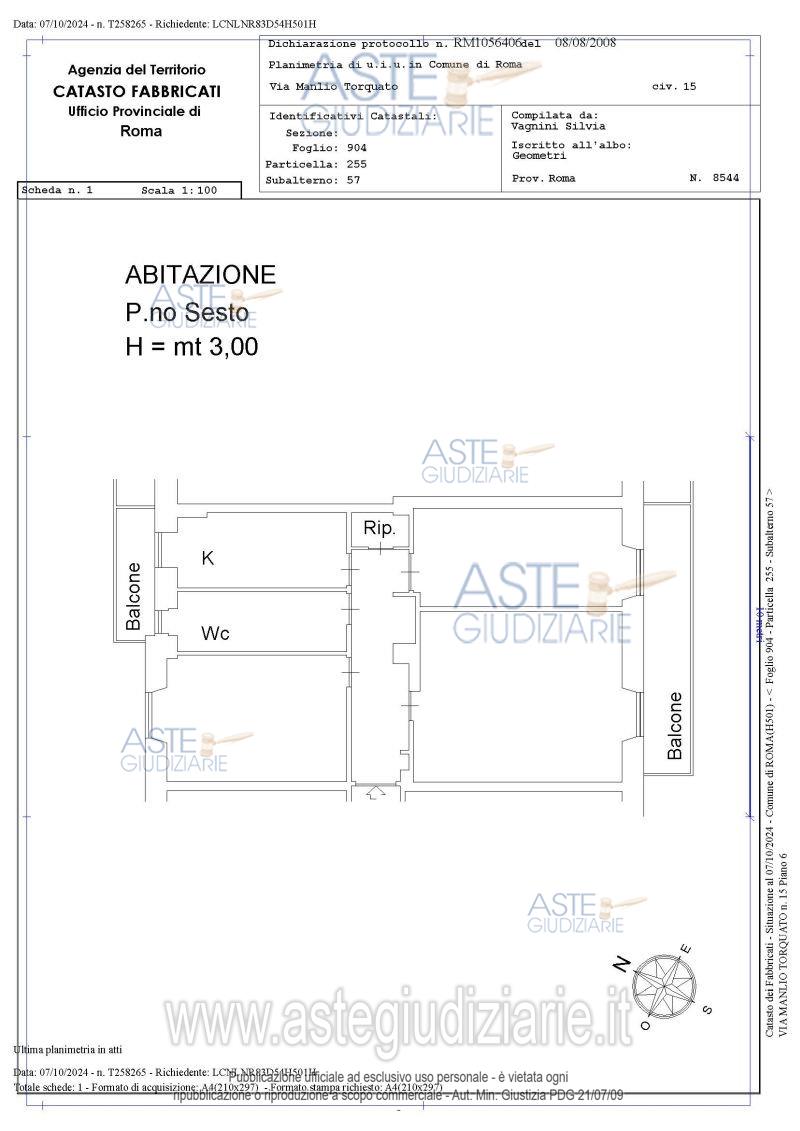 Vendita all'asta Senza incanto, con gara telematica asincrona - LOTTO UNICO: Appartamento in Roma, Via Manlio Torquato 15, circa 70 mq (lordi), 2 balconi, soggiorno, cucina, bagno, 2 camere e ripostiglio, con quota 1/1 proprietà superficiaria perenne box auto (pertinenziale Tognoli) Via Costamagna 8-10. Prezzo base € 237.000,00 (offerta minima € 177.750,00). Data inizio operazioni di vendita: 17/02/2026 ore 14:00. Giudice Dott. Miriam Iappelli. Professionista delegato alla vendita Dott. Andrea Russo. Custode Giudiziario Ivg Di Roma Srl - Email "pvp@visiteivgroma.it"; Tel. 0689569801. Rif. Tribunale di Roma - Espropriazione immobiliare (cartabia) n. 702/2023