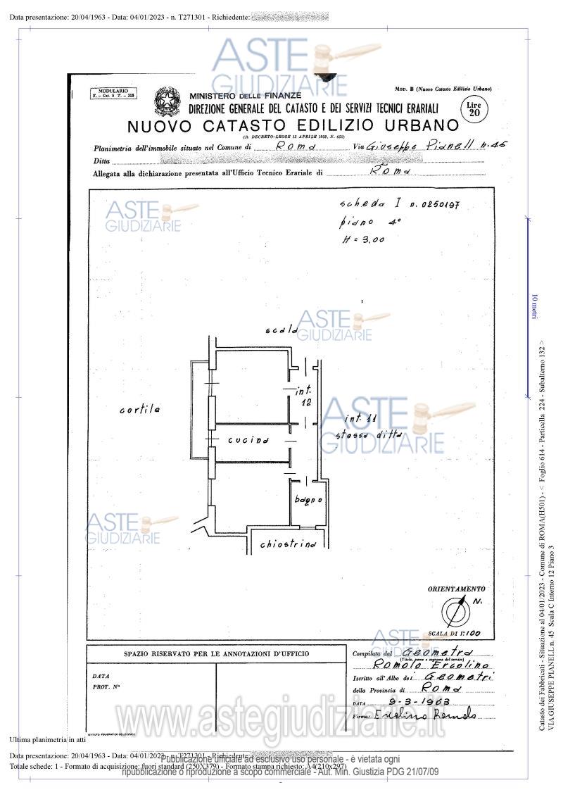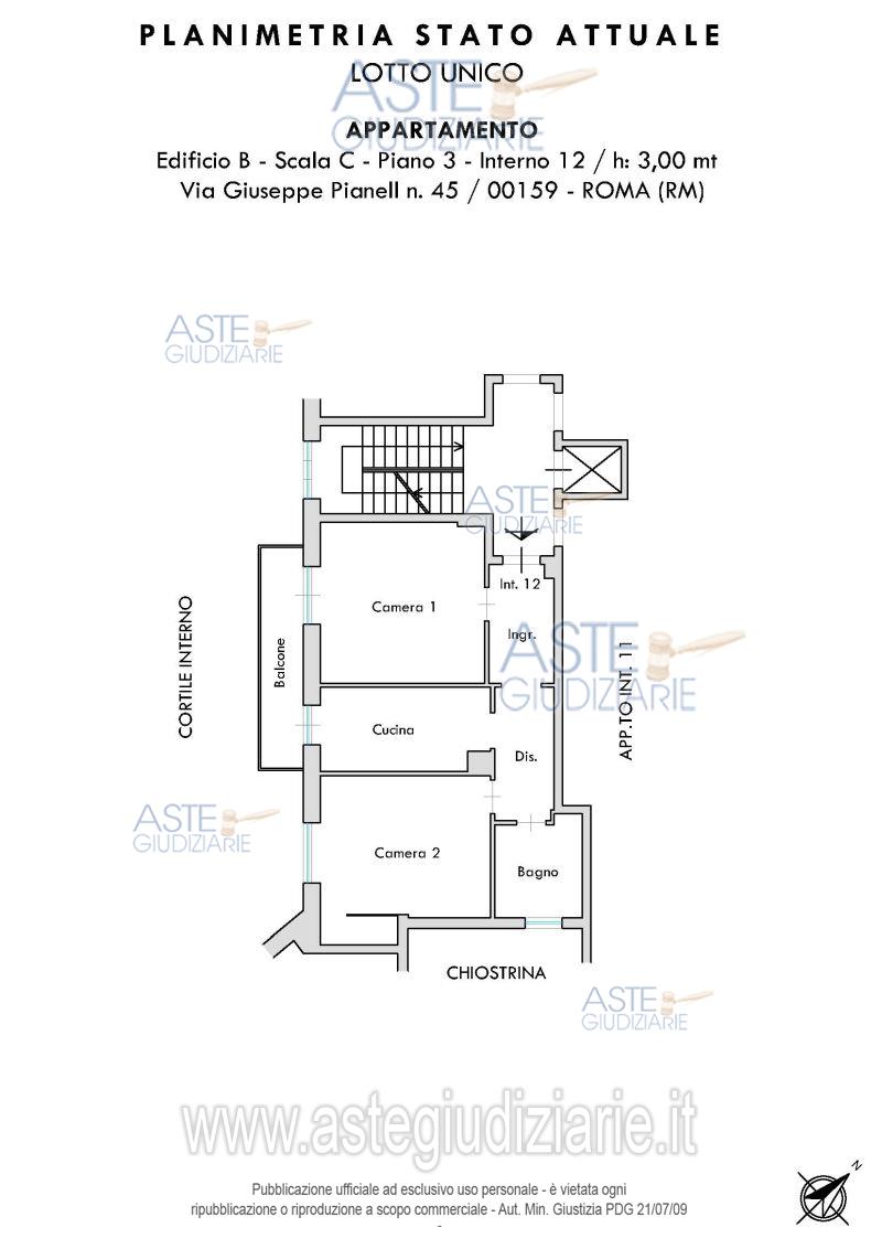 Vendita all'asta Senza incanto, con gara telematica asincrona - LOTTO UNICO: Quota pari a 1/1 del diritto di proprietà su appartamento sito in Roma, Via Giuseppe Pianell n. 45, edificio B, scala C, piano 3, interno 12, composto da ingresso, cucina, disimpegno, due camere, bagno e balcone, per complessivi mq. 62 di superficie convenzionale. Prezzo base € 180.000,00 (offerta minima € 135.000,00). Data inizio operazioni di vendita: 27/01/2026 ore 11:00. Giudice Fernando Scolaro. Professionista delegato alla vendita Avv. Antonella Callipari. Custode Giudiziario Ivg Di Roma Srl - Email "PVP@VISITEIVGROMA.IT"; Tel. 0689569801. Rif. Tribunale di Roma - Esecuzione immobiliare post legge 80 n. 591/2022
