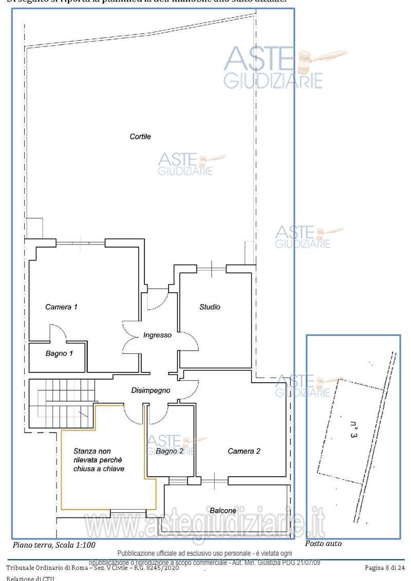 Vendita all'asta Senza incanto, con gara telematica asincrona - LOTTO UNICO: Quota pari a 1/1 del diritto di proprietà su appartamento ad uso civile abitazione posto al Piano T-S1, int.3 - Censito al Catasto Fabbricati di Roma al foglio 62, part. 1956, sub 13, Z.C. 3, Cat. A/2, classe 6, vani 10,5, Superficie catastale 229 mq, escluse aree scoperte 209 mq, r.c. € 1,708,18 (appartamento). Inoltre, posto auto posto al Piano T. int.3 -foglio 62-, part. 1956-, sub 4-, Z.C.3, Cat. C/6, classe 6 (in atti 8), consistenza 15 Mq, r.c. € 32,54 (posto auto). Prezzo base € 420.000,00 (offerta minima € 315.000,00). Data inizio operazioni di vendita: 12/03/2026 ore 11:00. Professionista delegato alla vendita Avv. Gabriella Bosco - Email "avvgbosco@gmail.com". Rif. Tribunale di Roma - Contenzioso civile n. 8245/2020