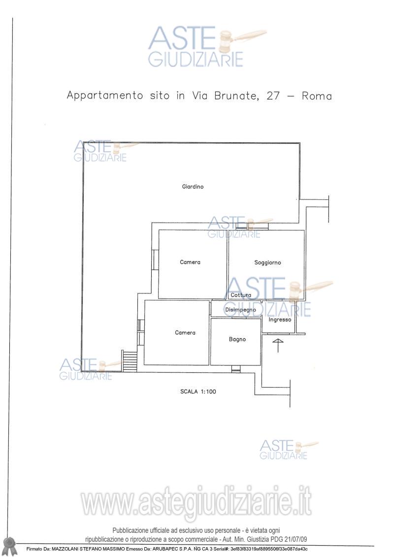 Vendita all'asta Senza incanto, con gara telematica asincrona - LOTTO UNICO: Quota pari a 1/1 del diritto di intera proprietà su appartamento ubicato a Roma (RM) - via Brunate n.27, interno 1, al piano terra con annesso giardino di superficie circa pari a 80 mq, di una palazzina di 4 piani. Prezzo base € 230.500,00 (offerta minima € 172.875,00). Data inizio operazioni di vendita: 27/04/2026 ore 11:00. Giudice D'ambrosio. Professionista delegato alla vendita Avv. Alessandro Orsini. Custode Giudiziario Ivg Di Roma Srl - Email "pvp@visiteivgroma.it"; Tel. 0689569801. Rif. Tribunale di Roma - Espropriazione immobiliare (cartabia) n. 1084/2024
