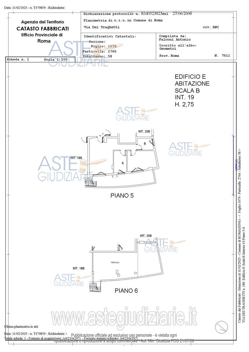 Vendita all'asta Senza incanto, con gara telematica asincrona - LOTTO UNICO: Quota pari a 1/1 del diritto di piena proprietà su appartamento ubicato a Roma, località Ostia Lido Ponente, Via dei Traghetti n. 180, edificio “E”, sc. B, int. 19, piano 5 (appartamento) e piano 6 (soprastante terrazza), Comparto “1”, “Proposta B5” del Programma di Riqualificazione Urbana di “Ostia Ponente”. Prezzo base € 191.000,00 (offerta minima € 143.250,00). Data inizio operazioni di vendita: 21/05/2026 ore 13:00. Giudice Dott. Giuseppe Lauropoli. Professionista delegato alla vendita Avv. Elisa Serrao. Custode Giudiziario Ivg Di Roma Srl - Email "info@ivgroma.it"; Tel. 0683751500. Rif. Tribunale di Roma - Espropriazione immobiliare (cartabia) n. 414/2024