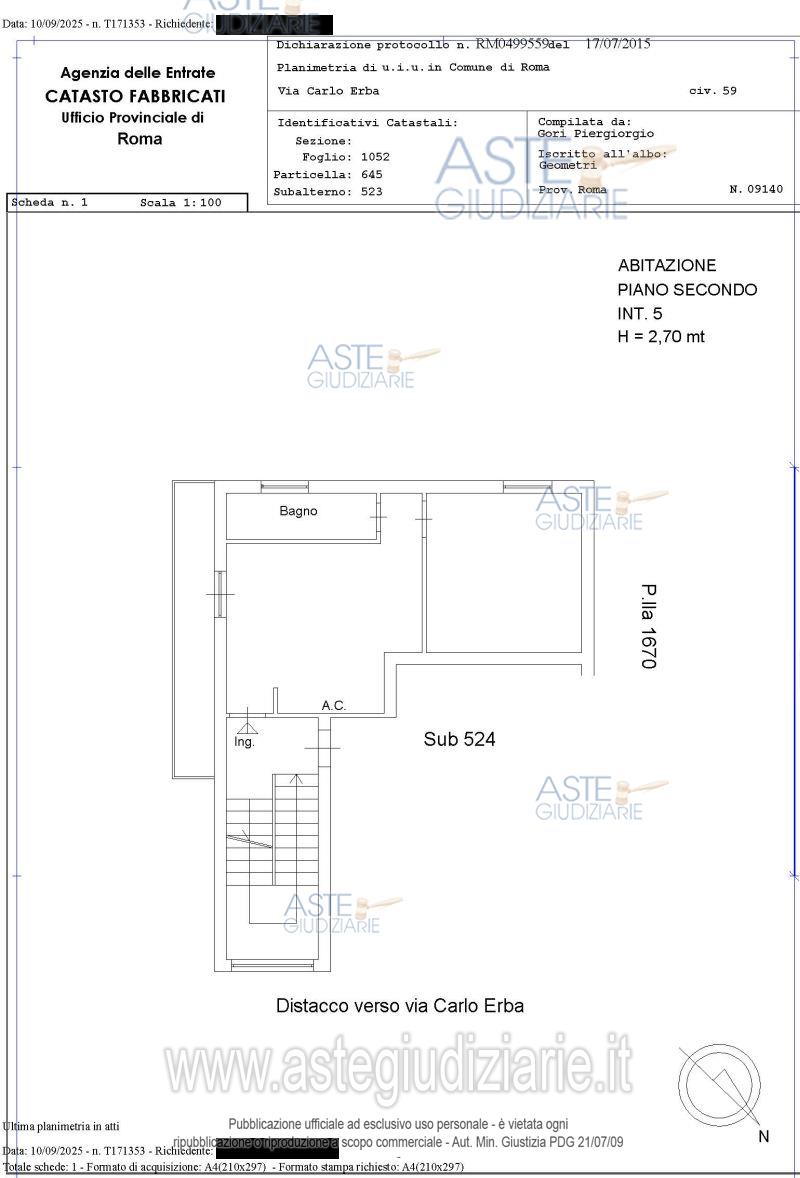 Vendita all'asta Senza incanto, con gara telematica asincrona - LOTTO UNICO: appartamento sito in Roma (RM) – Via Carlo Erba n. 59 piano 2 int. 5, composto da ingresso/soggiorno con angolo cottura, una camera, servizi e balcone, per complessivi mq. 49,Identificato al Catasto Fabbricati del Comune di Roma al foglio n. 1052, part. 645, sub. 523, z.c. 6 categoria A/3, r.c. € 355,06. Prezzo base € 72.000,00 (offerta minima € 54.000,00). Data inizio operazioni di vendita: 16/06/2026 ore 15:00. Giudice: Iappelli.