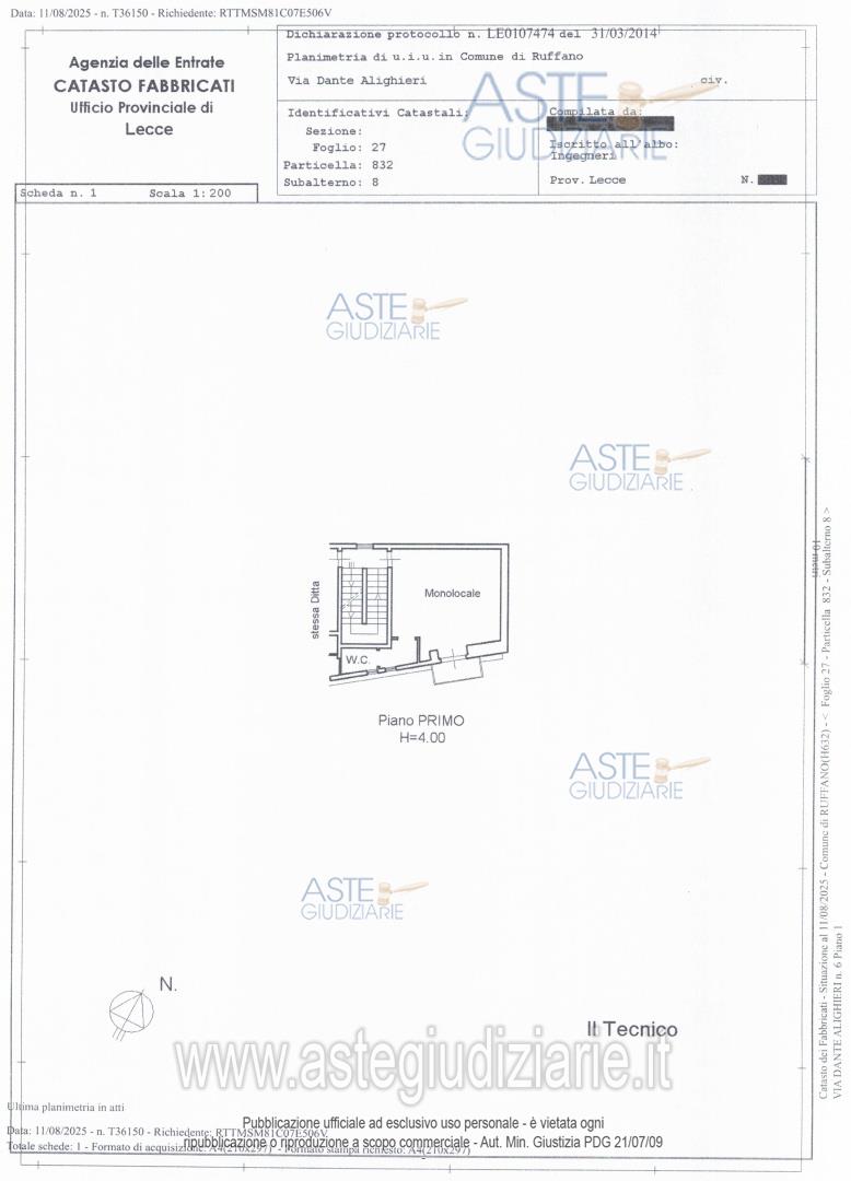 Vendita all'asta Senza incanto, con gara telematica asincrona - LOTTO 4: Piena proprietà per la quota di 1/1 di appartamento sito in Ruffano (LE) alla via Alighieri n. 6. Prezzo base € 16.022,50 (offerta minima € 12.016,88). Data inizio operazioni di vendita: 30/04/2026 ore 11:30. Professionista delegato alla vendita Avv. Gino Rosario Marzano - Email "ginomarzano@gmail.com"; Cell. 3491746540; Tel. 0836541917. Custode Giudiziario Avv. Gino Rosario Marzano - Email "ginomarzano@gmail.com"; Cell. 3491746540; Tel. 0836541917. Rif. Tribunale di Lecce - Espropriazione immobiliare (cartabia) n. 348/2024
