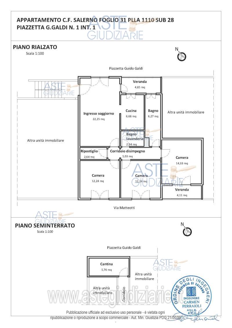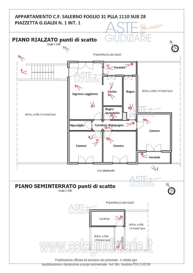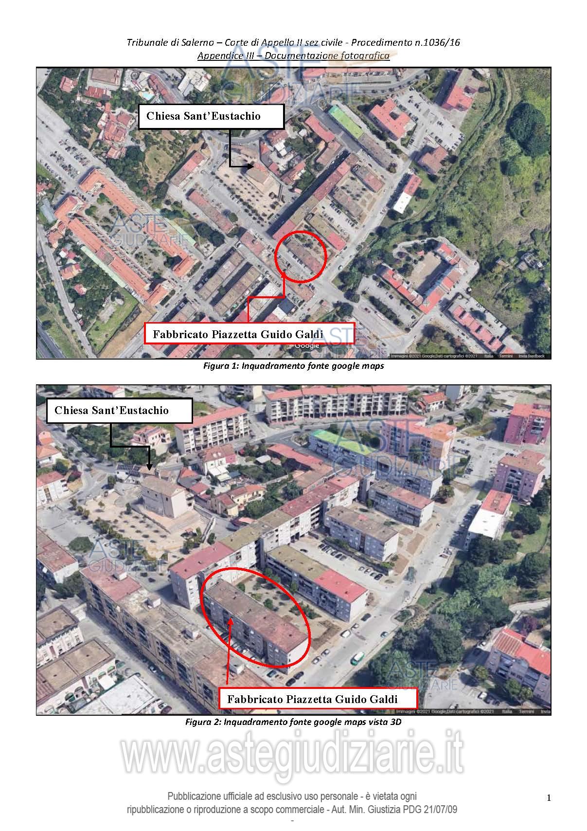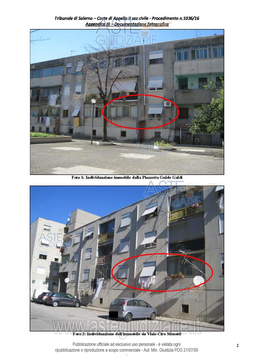 Vendita all'asta Senza incanto, con gara telematica asincrona - LOTTO UNICO: Appartamento per civile abitazione di edilizia popolare sito in Salerno, località Sant’Eustachio, piazzetta G. Galdi, n.1, piano rialzato, costituito da soggiorno, cucina, disimpegno, tre camere, due bagni, ripostiglio e cantina seminterrata ad uso deposito, per una superficie commerciale complessiva di mq. 106. Prezzo base € 116.250,00 (offerta minima € 87.187,00). Data inizio operazioni di vendita: 22/01/2026 ore 11:30. Giudice Dott. Alessandro Brancaccio. Corte d'Appello di Salerno - Contenzioso civile n. 1036/2016