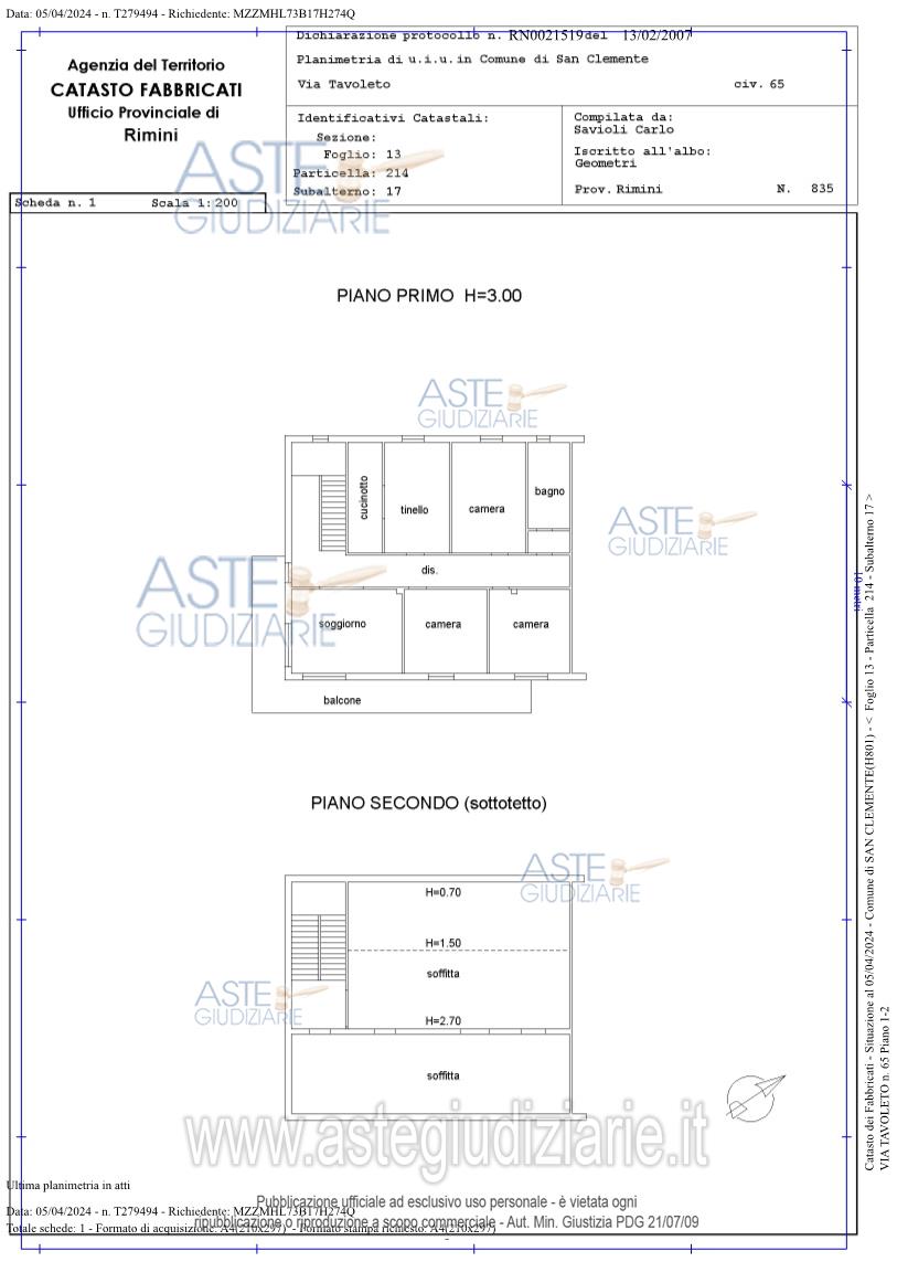 Vendita all'asta Senza incanto, con gara telematica asincrona - LOTTO 2: Piena proprietà di porzioni del fabbricato urbano sito nel Comune di San Clemente (RN), località Sant'Andrea in Casale, Via Tavoleto n. 65 e, precisamente, un appartamento sito al piano primo e sottotetto con accesso al vano terra (attualmente chiuso) sviluppante una superficie lorda complessiva di circa mq. 151, oltre a balcone di circa mq. 28 lordi e piano sottotetto al grezzo di ulteriori mq. 150. Prezzo base € 164.000,00 (offerta minima € 123.000,00). Data inizio operazioni di vendita: 03/03/2026 ore 11:00. Giudice Dott. Letizia Bocchini. Professionista delegato alla vendita Not. Andrea Aquilina - Email "esecuzioni@notaioaquilina.it". Custode Giudiziario Not. Andrea Aquilina - Email "esecuzioni@notaioaquilina.it"; Tel. 054154139. Rif. Tribunale di Rimini - Espropriazione immobiliare (cartabia) n. 68/2023