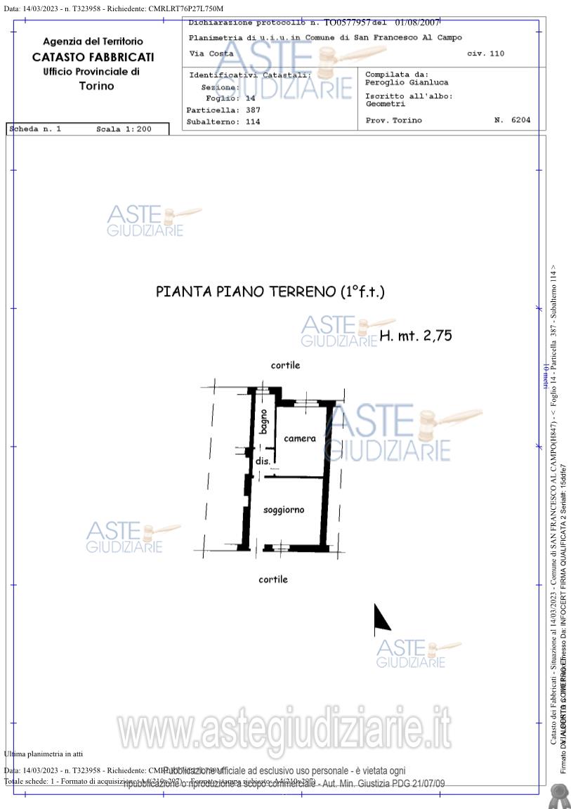 Vendita all'asta Senza incanto, con gara telematica asincrona - LOTTO UNICO:  Appartamento ubicato a San Francesco al Campo (TO) - VIA COSTA 81 (già c. n.110) sito al piano terreno (1°p.f.) H = 2,75m. Composto di una camera, soggiorno, disimpegno e servizi, posto alle coerenze: cortile, altro alloggio del piano e ancora cortile. Prezzo base € 30.295,20 (offerta minima € 22.721,40). Data inizio operazioni di vendita: 18/11/2025 ore 11:00. Giudice Augusto Salustri. Professionista delegato alla vendita Avv. Giada Meschinelli - Email "avvgiadameschinelli@gmail.com". Custode Giudiziario  Torino Ifir Piemonte - Email "richiestevisite.ivrea@ivgpiemonte.it".  Rif. Tribunale di Ivrea - Contenzioso civile n. 3785/2023