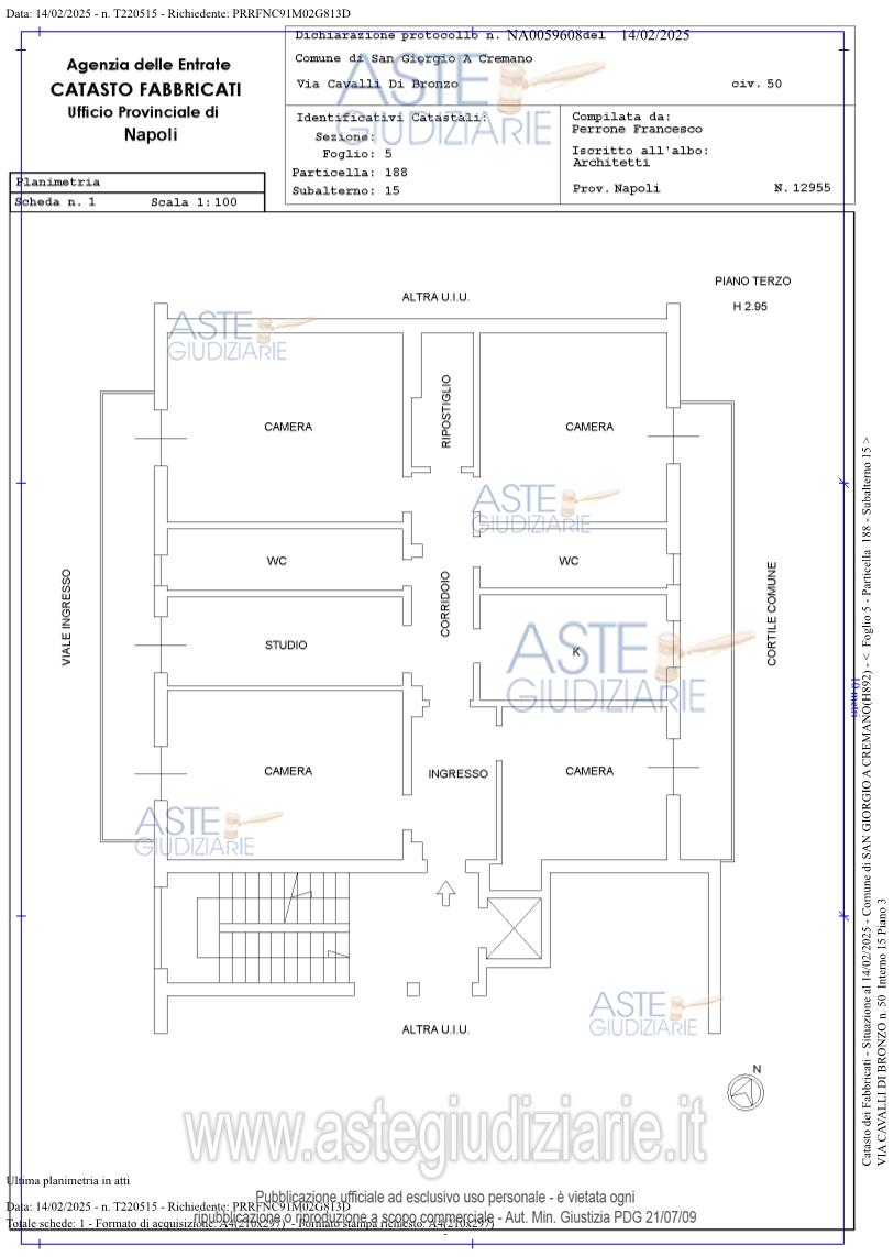 Vendita all'asta Senza incanto - LOTTO UNICO: Piena ed esclusiva proprietà di appartamento di circa mq 155,99 commerciali, mq 139,65 utili, con altezza media degli ambienti interni è di m 2,95, posto al piano terzo composto da ingresso, corridoio, ripostiglio, cucina, soggiorno, tre camere da letto, due bagni, un vano adibito ad ufficio e due terrazzini. Prezzo base € 239.498,86 (offerta minima € 179.625,00). Data vendita 21/07/2026 ore 13:00. Giudice: Fabio Lombardo.