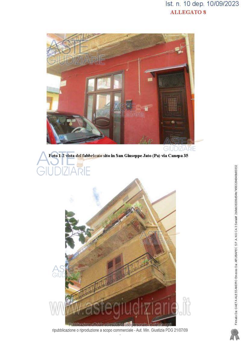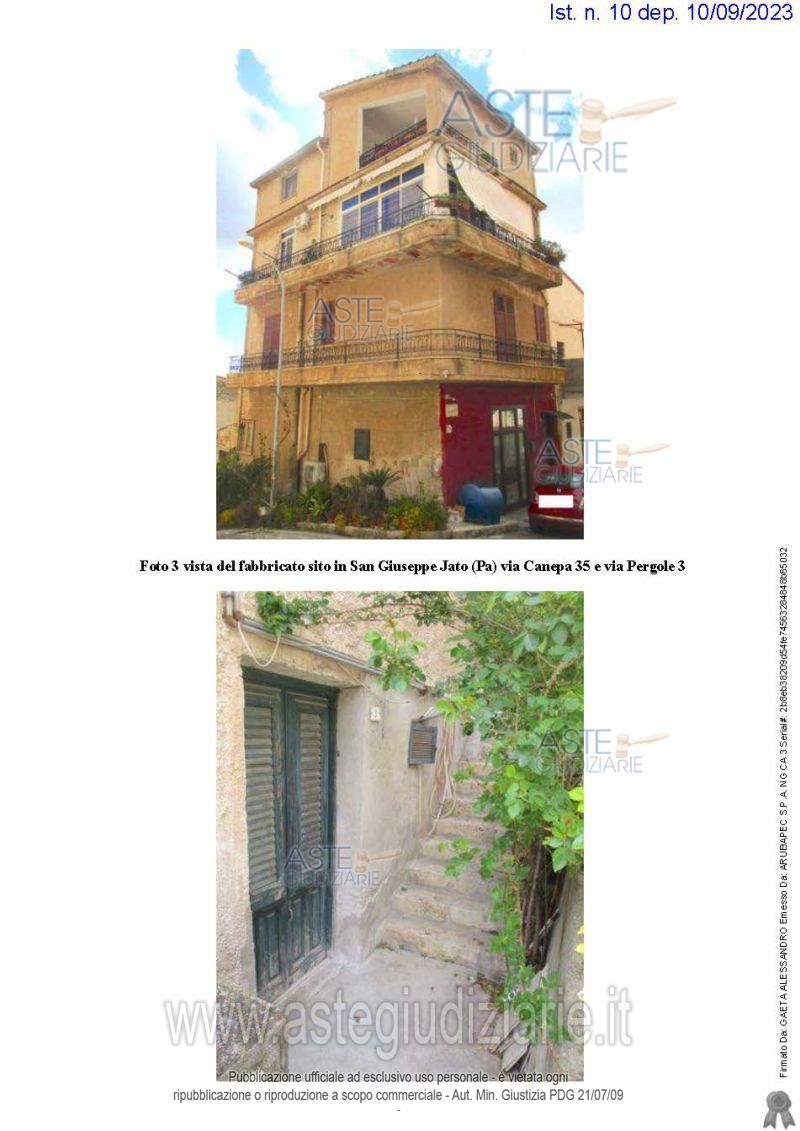 Vendita all'asta Senza incanto, con gara telematica sincrona mista - LOTTO UNICO: Piena ed esclusiva proprietà dell’immobile sito nel comune di San Giuseppe Jato (Pa) identificato al catasto fabbricati al fg 3, p.lla 240, sub 1, nat. A/4, consistenza 10 vani; via Canepa n.37 piano S1-T-1-2. Palazzina unifamiliare semi indipendente su quattro livelli f.t. sita in San Giuseppe Jato (Palermo) ad angolo tra le vie Canepa e via Pergole, con accesso dal civ.35/37 piano terra e via Pergole 3 (già 43) per il solo locale seminterrato (collegato a sua volta al piano terra tramite scala interna). Prezzo base € 16.672,50 (offerta minima € 12.504,38). Data vendita 02/04/2026 ore 16:00. Giudice Gigi Omar Modica. Professionista delegato alla vendita Avv. Giorgia Gallo - Email "g.gallo@legalegallo.it"; Tel. 0916257841. Custode Giudiziario Avv. Giorgia Gallo - Email "g.gallo@legalegallo.it"; Tel. 0916257841. Rif. Tribunale di Palermo - Esecuzione immobiliare post legge 80 n. 144/2021