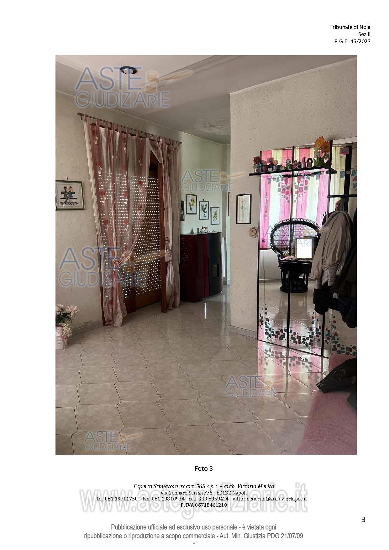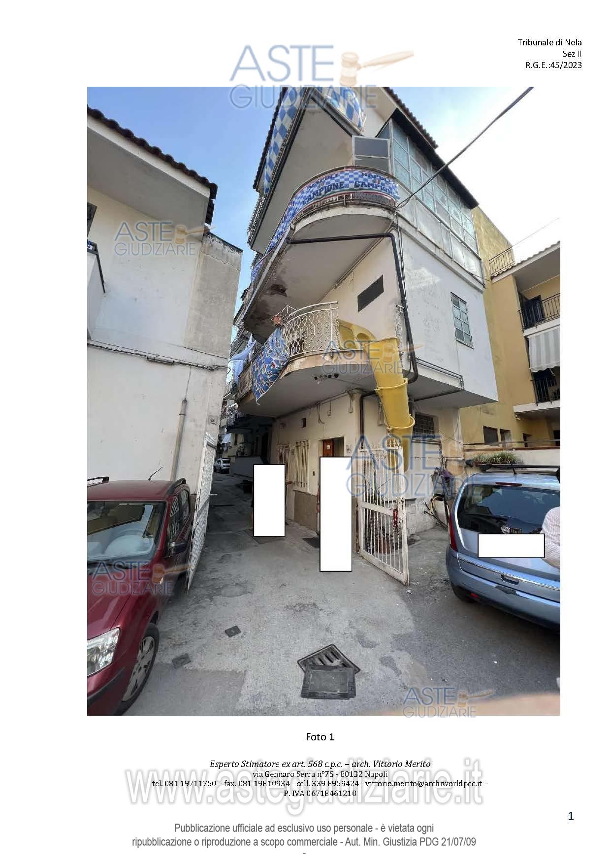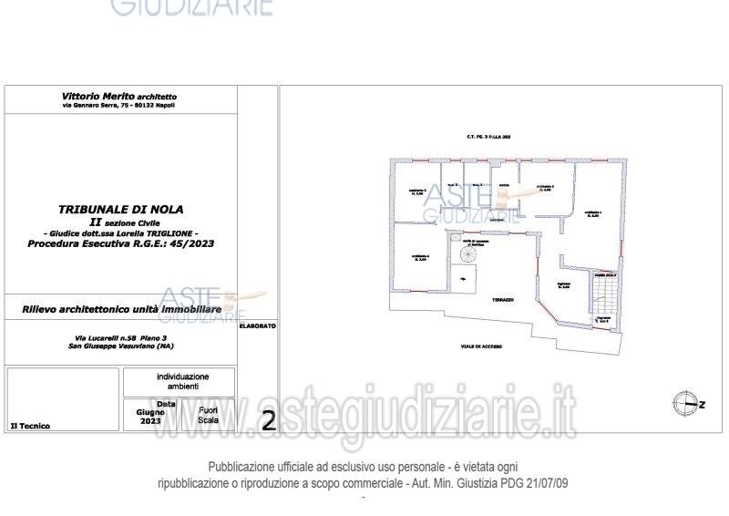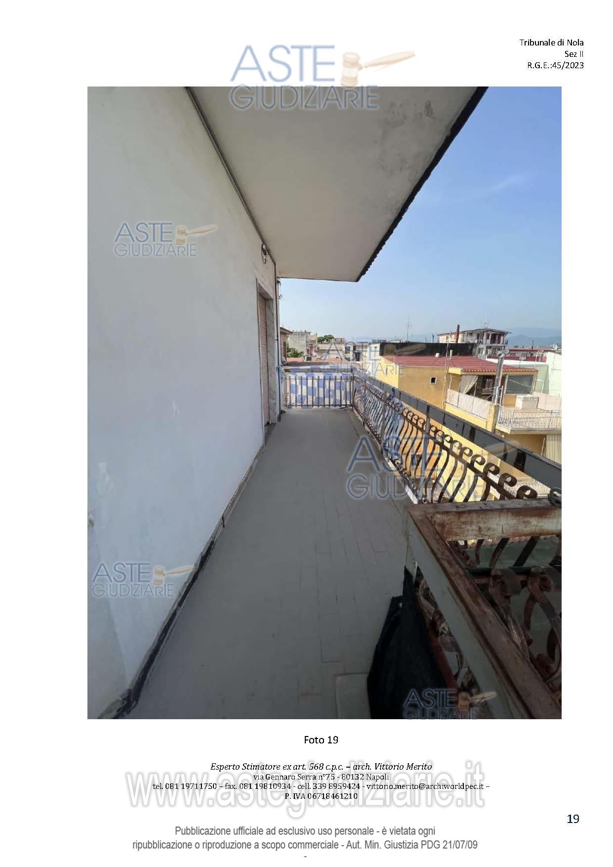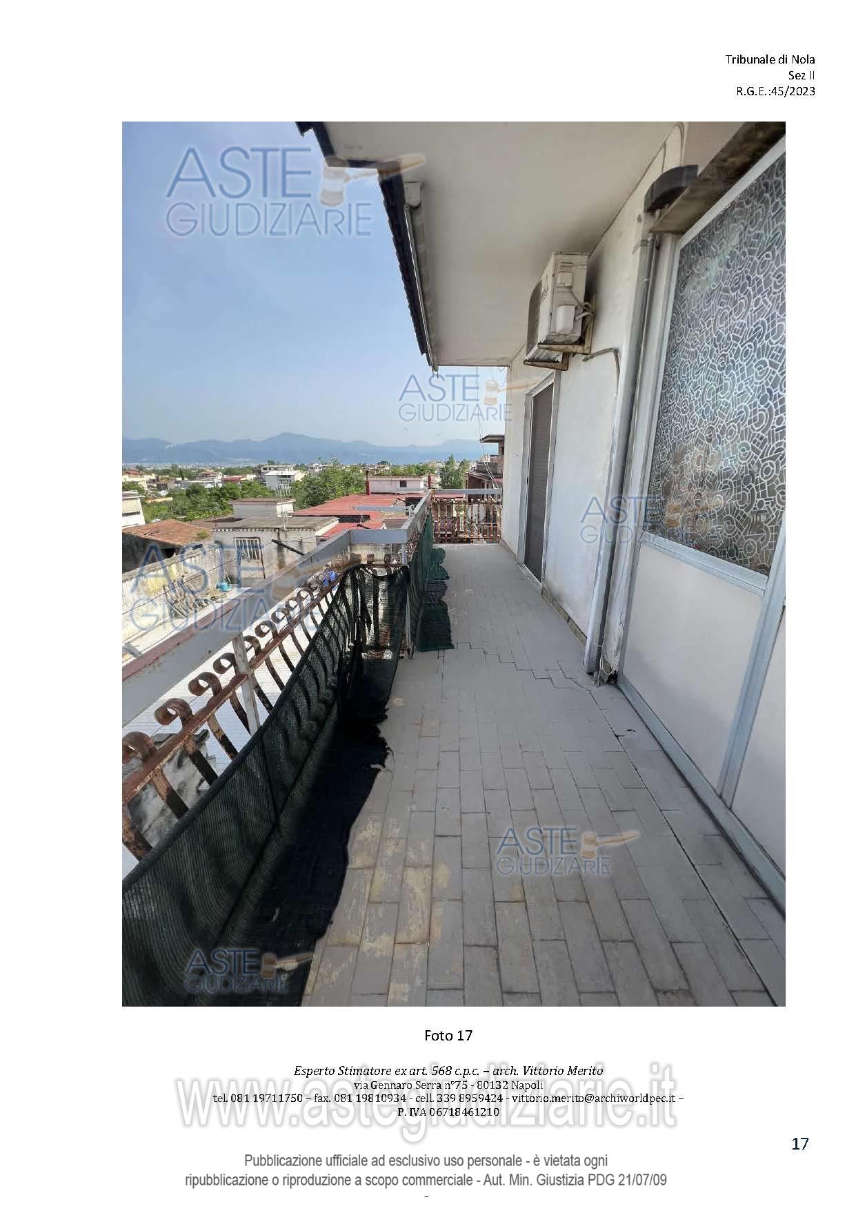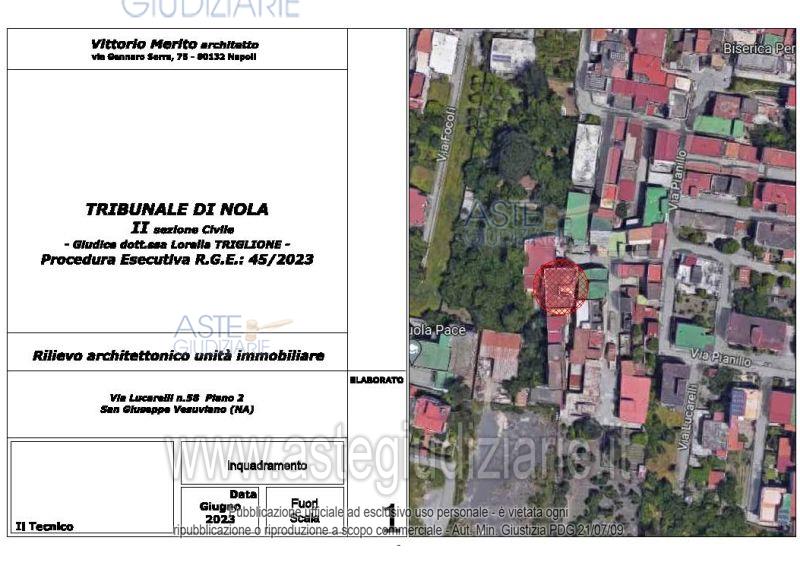 Vendita all'asta Senza incanto, con gara telematica asincrona - LOTTO 2: San Giuseppe Vesuviano, via Lucarelli n. 55/14, piano 3, proprietà appartamento, composto da ingresso, 4 ambienti, cucina, corridoio, 2 w.c. e terrazzo con ripostiglio in alluminio. Sup. netta abitazione 140 mq, terrazza 63. Occupato dal debitore esecutato. Realizzato senza titolo edilizio e istanza di condono incompleta e priva di grafici, ma ancora in corso di definizione. Difformità non sanabili rispetto a planimetria catastale: realizzazione scala di accesso al lastrico solare. Prezzo base € 30.131,77 (offerta minima € 22.598,83). Data inizio operazioni di vendita: 10/12/2025 ore 09:00. Professionista delegato alla vendita Avv. Maria Luigia Miccio - Email "marialuigiamiccio@libero.it"; Tel. 3497580644. Custode Giudiziario Avv. Maria Luigia Miccio - Email "marialuigiamiccio@libero.it"; Tel. 3497580644. Rif. Tribunale di Nola - Espropriazione immobiliare (cartabia) n. 45/2023