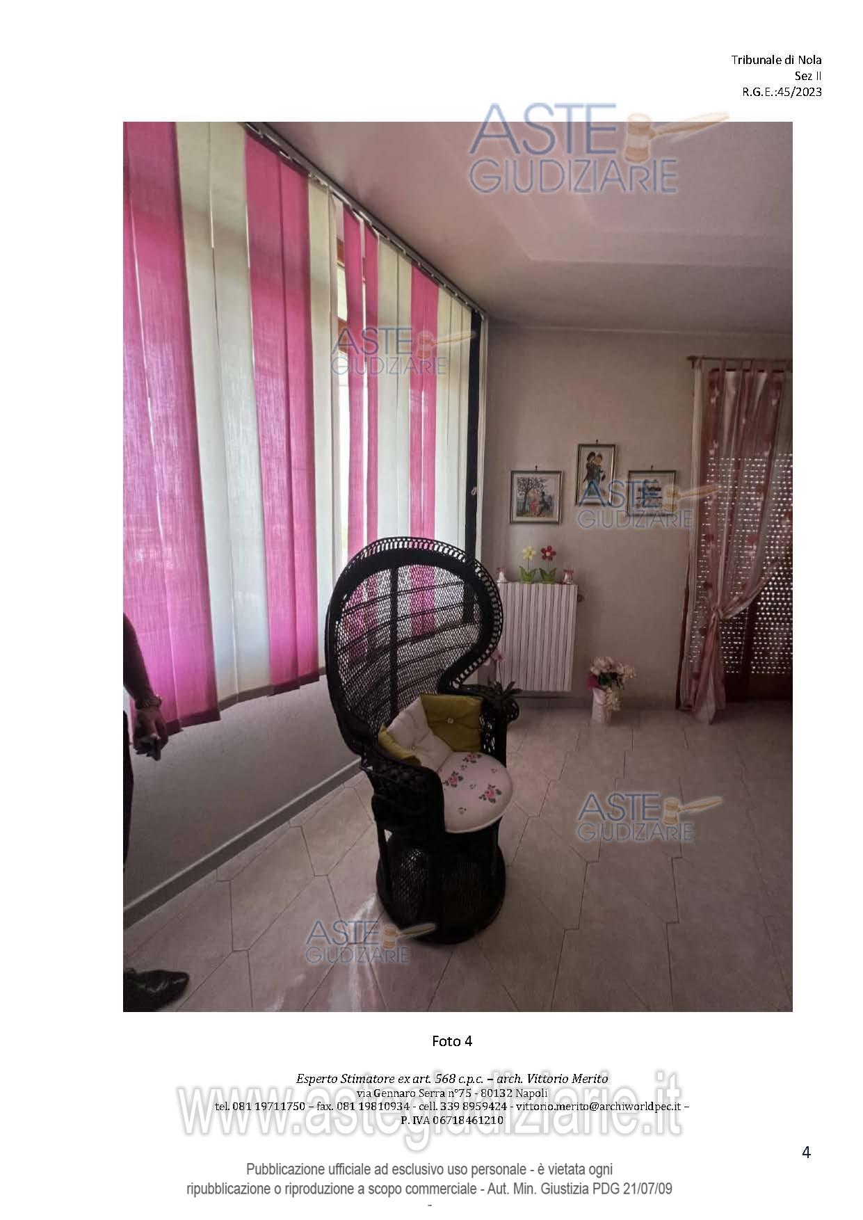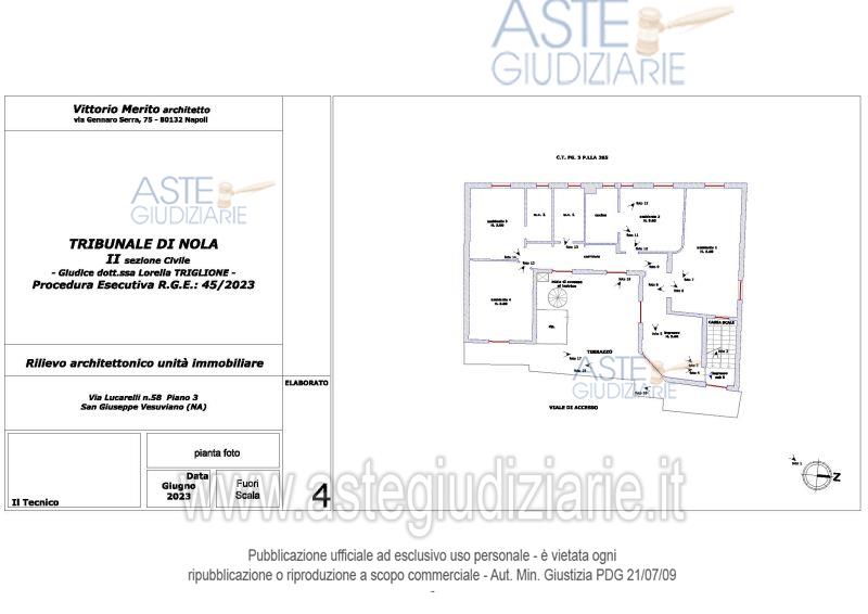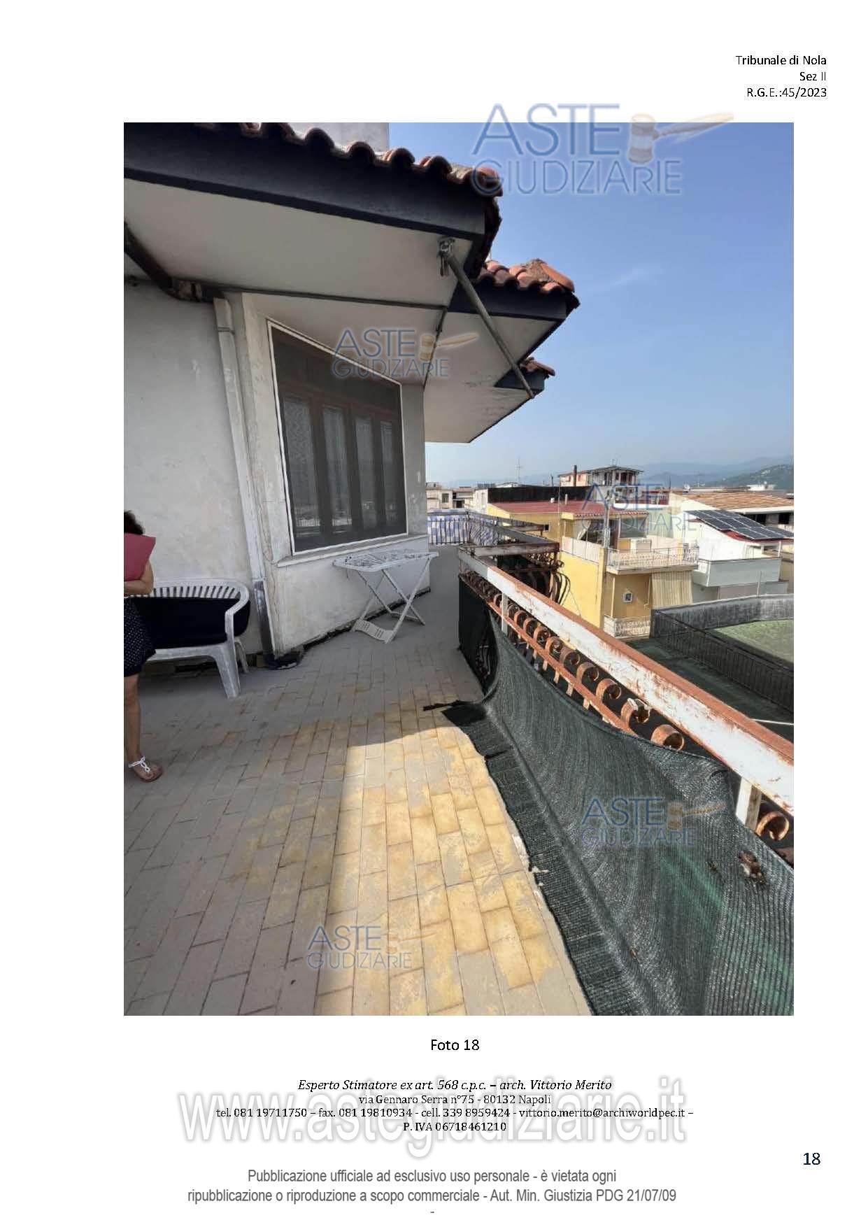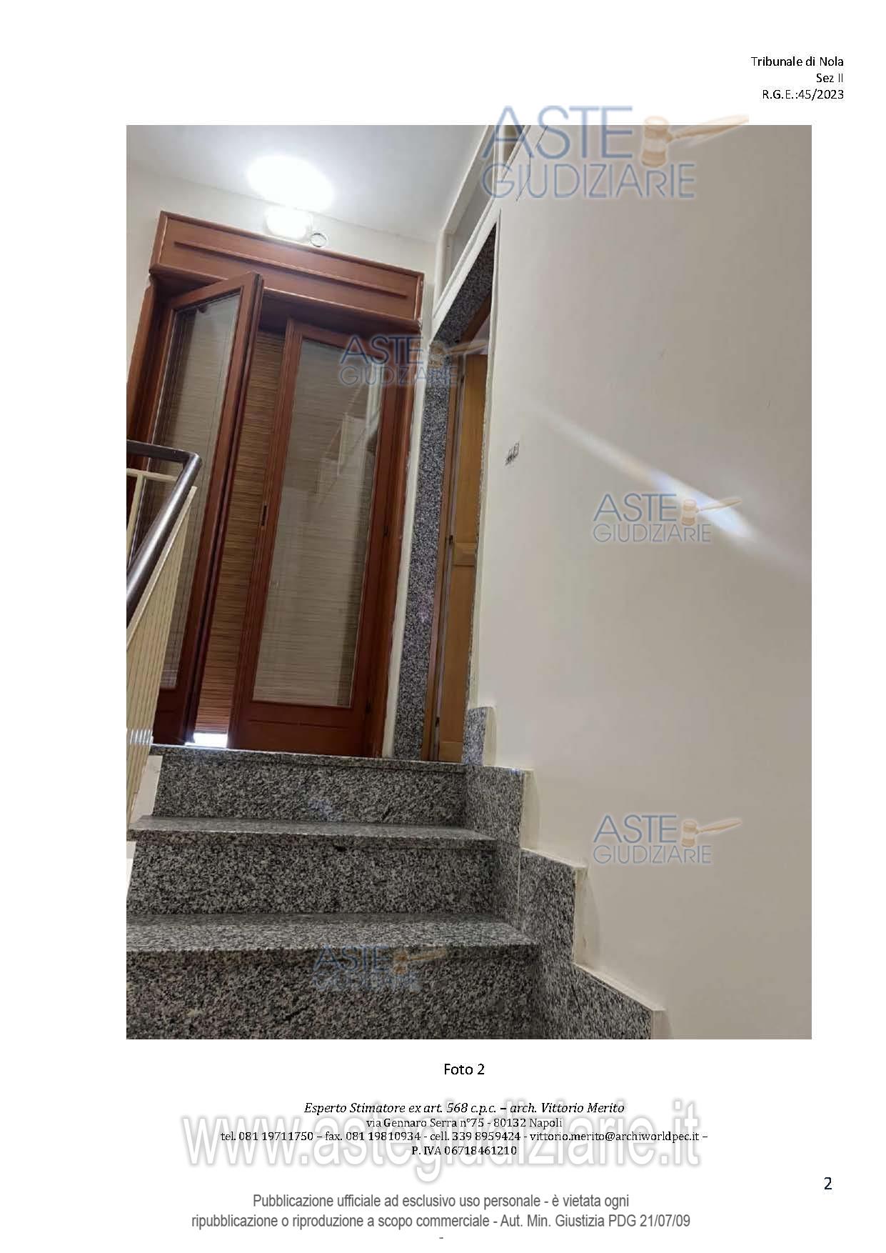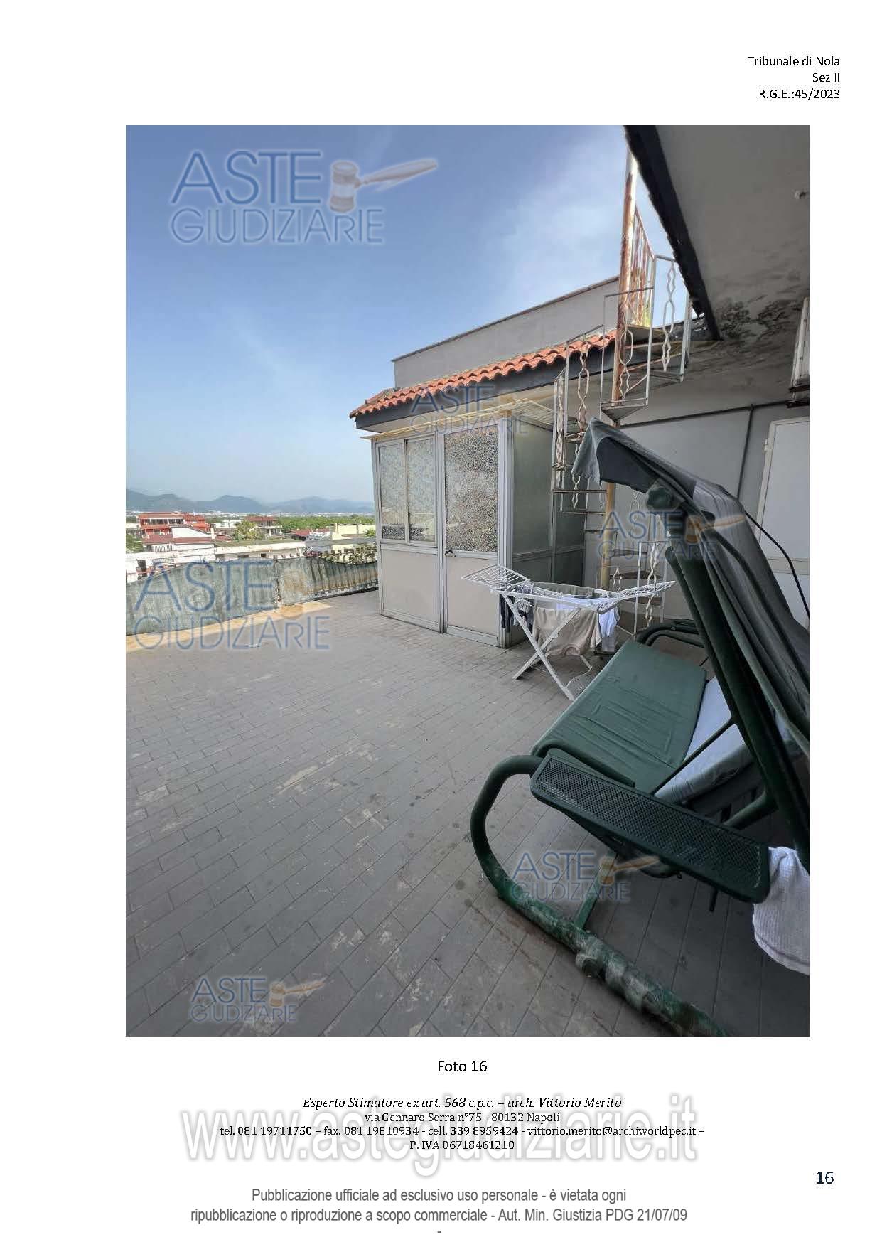 Vendita all'asta Senza incanto, con gara telematica asincrona - LOTTO 2: San Giuseppe Vesuviano, via Lucarelli n. 55/14, piano 3, proprietà appartamento, composto da ingresso, 4 ambienti, cucina, corridoio, 2 w.c. e terrazzo con ripostiglio in alluminio. Sup. netta abitazione 140 mq, terrazza 63. Occupato dal debitore esecutato. Realizzato senza titolo edilizio e istanza di condono incompleta e priva di grafici, ma ancora in corso di definizione. Difformità non sanabili rispetto a planimetria catastale: realizzazione scala di accesso al lastrico solare. Prezzo base € 30.131,77 (offerta minima € 22.598,83). Data inizio operazioni di vendita: 10/12/2025 ore 09:00. Professionista delegato alla vendita Avv. Maria Luigia Miccio - Email "marialuigiamiccio@libero.it"; Tel. 3497580644. Custode Giudiziario Avv. Maria Luigia Miccio - Email "marialuigiamiccio@libero.it"; Tel. 3497580644. Rif. Tribunale di Nola - Espropriazione immobiliare (cartabia) n. 45/2023
