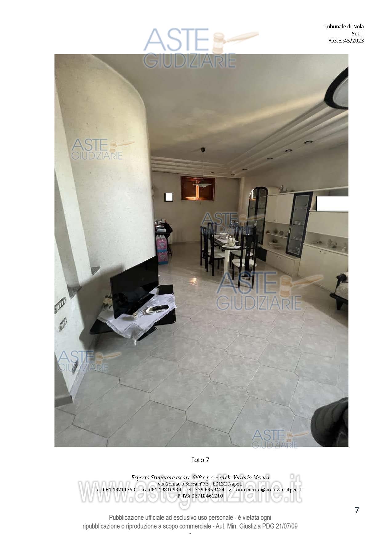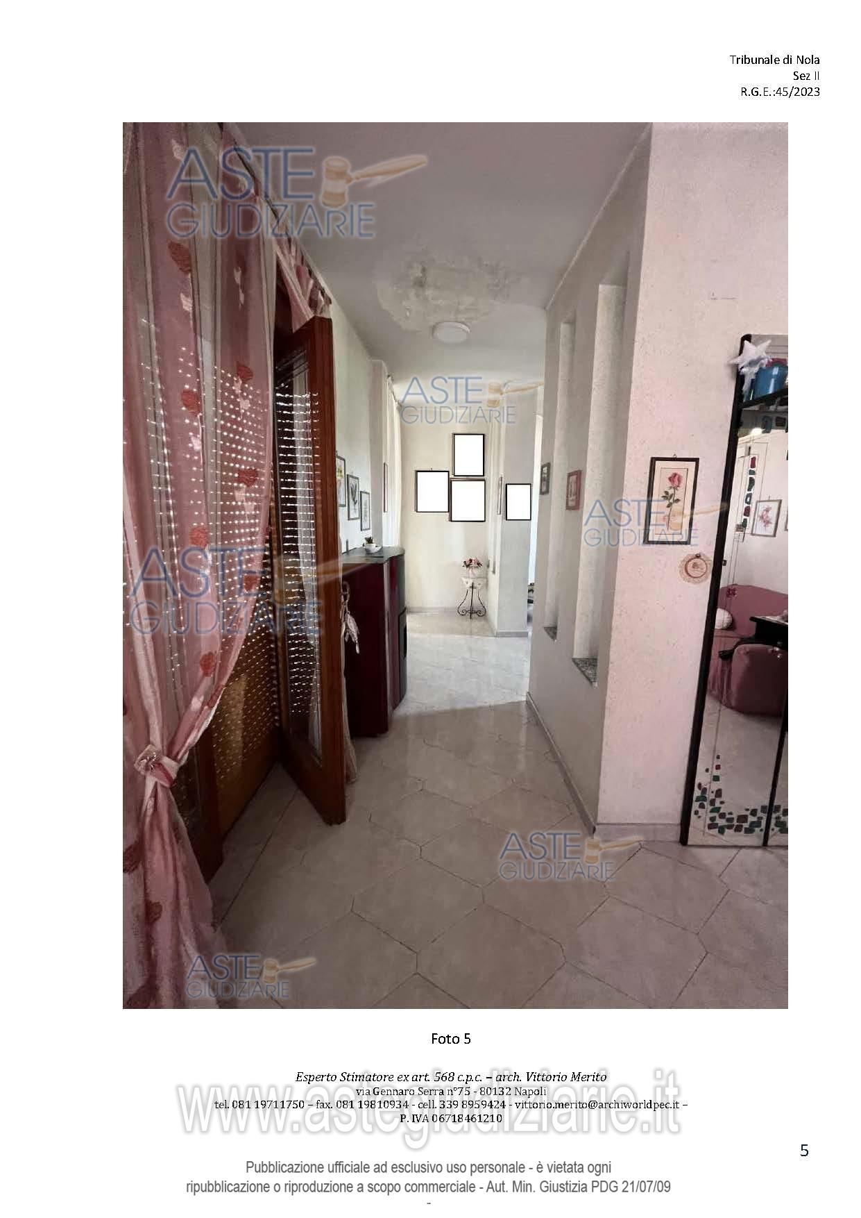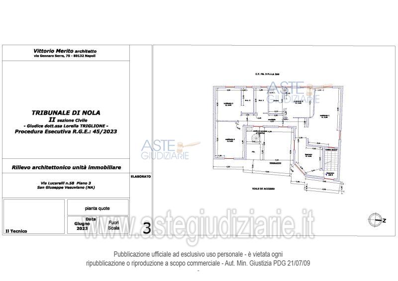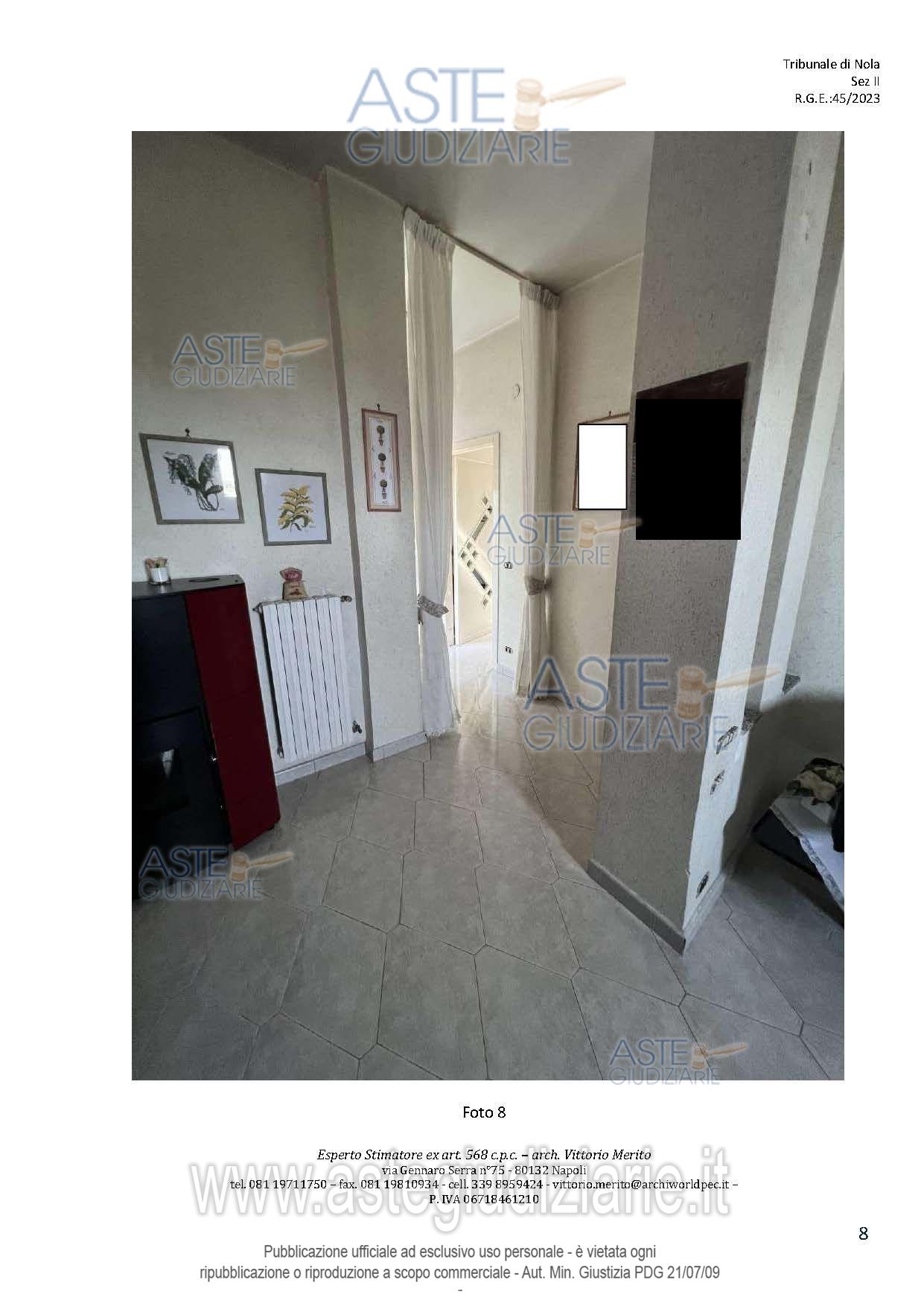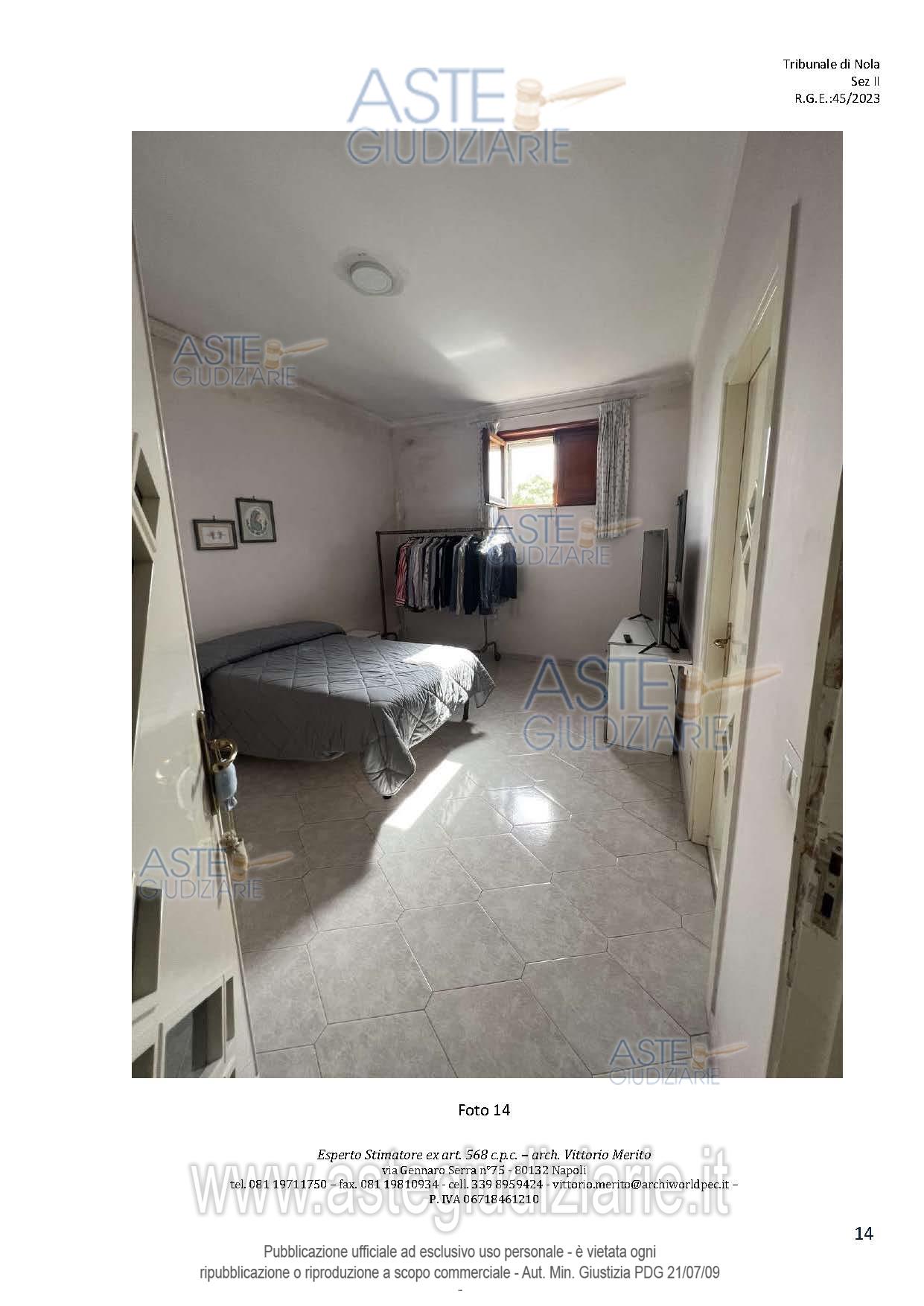 Vendita all'asta Senza incanto, con gara telematica asincrona - LOTTO 2: San Giuseppe Vesuviano, via Lucarelli n. 55/14, piano 3, proprietà appartamento, composto da ingresso, 4 ambienti, cucina, corridoio, 2 w.c. e terrazzo con ripostiglio in alluminio. Sup. netta abitazione 140 mq, terrazza 63. Occupato dal debitore esecutato. Realizzato senza titolo edilizio e istanza di condono incompleta e priva di grafici, ma ancora in corso di definizione. Difformità non sanabili rispetto a planimetria catastale: realizzazione scala di accesso al lastrico solare. Prezzo base € 30.131,77 (offerta minima € 22.598,83). Data inizio operazioni di vendita: 10/12/2025 ore 09:00. Professionista delegato alla vendita Avv. Maria Luigia Miccio - Email "marialuigiamiccio@libero.it"; Tel. 3497580644. Custode Giudiziario Avv. Maria Luigia Miccio - Email "marialuigiamiccio@libero.it"; Tel. 3497580644. Rif. Tribunale di Nola - Espropriazione immobiliare (cartabia) n. 45/2023