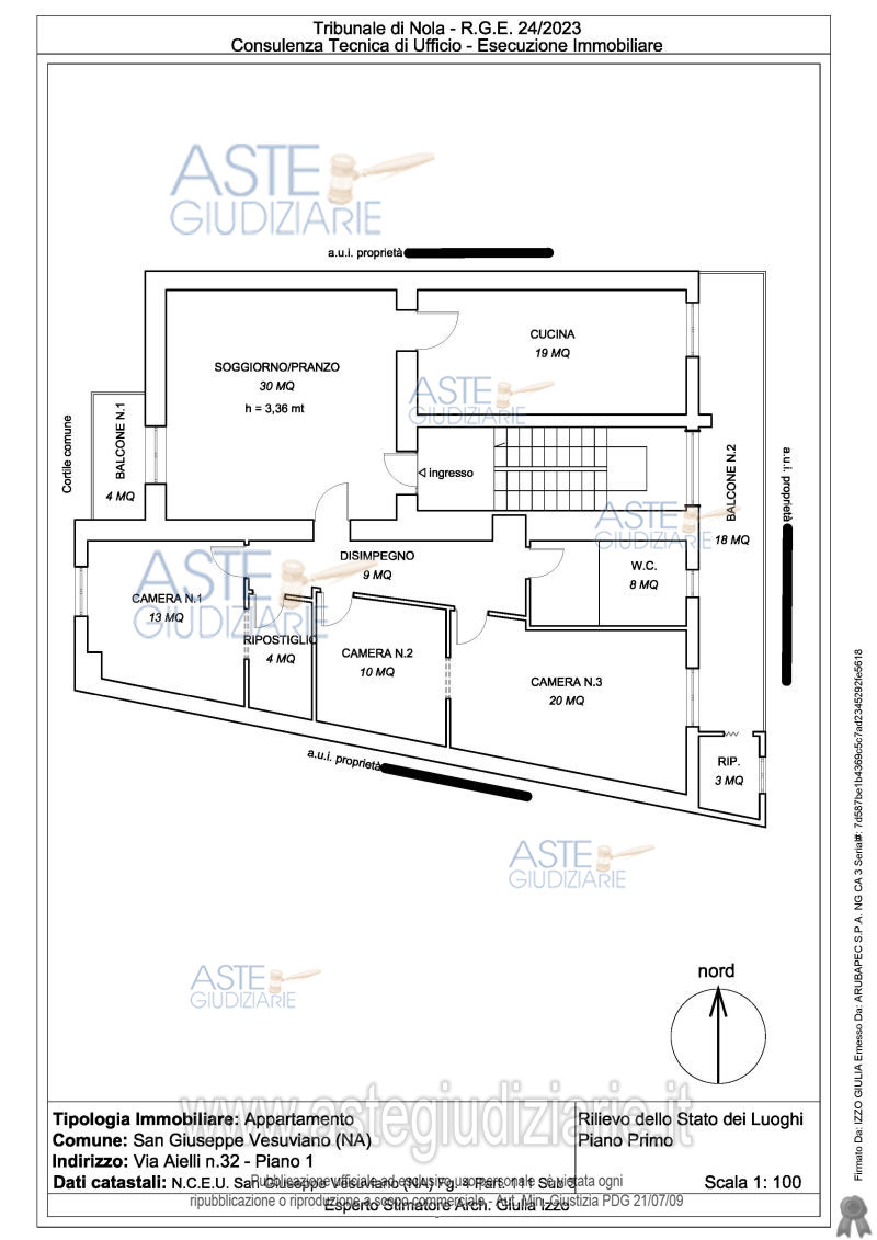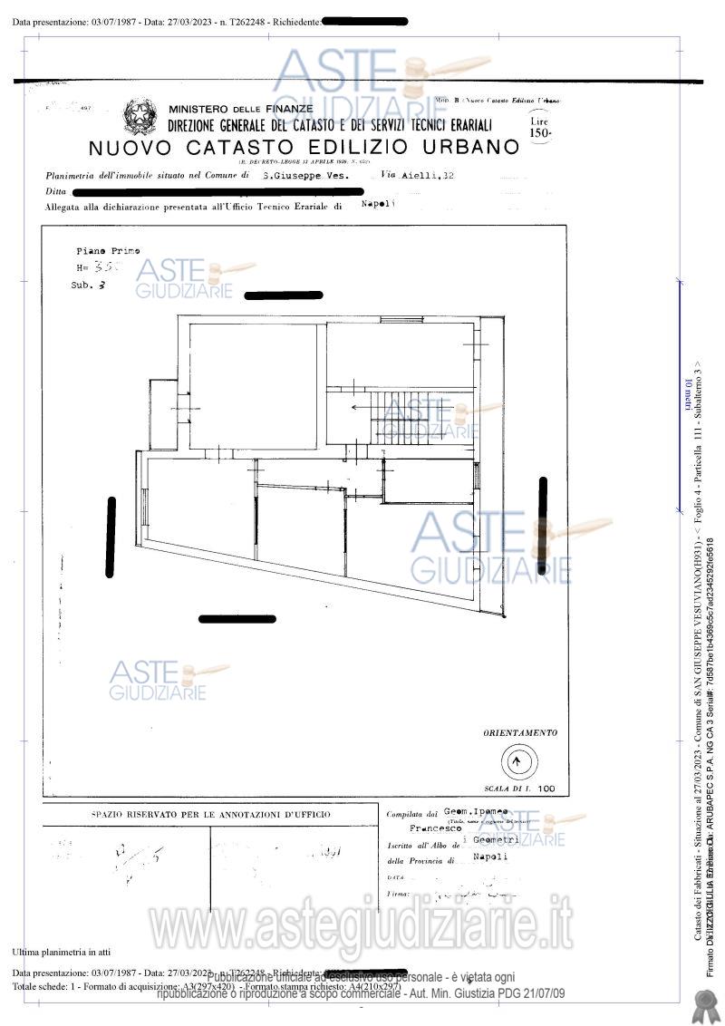 Vendita all'asta Senza incanto, con gara telematica asincrona - LOTTO UNICO: Piena ed intera proprietà di appartamento in San Giuseppe Vesuviano Via Aielli n.218 (già 32) posto al primo piano, avente accesso dalla porta posta frontalmente, salendo le scale, composto da soggiorno, disimpegno, tre camere, cucina, un bagno ed un ripostiglio, della superficie commerciale lorda di mq.146,50. Prezzo base € 39.750,00 (offerta minima € 29.813,00). Data inizio operazioni di vendita: 26/11/2025 ore 16:00. Giudice Dott. Gennaro Beatrice. Professionista delegato alla vendita Avv. Sabatino Madonna - Email "sabatino.madonna@legalecm.it"; Tel. 08231656102. Custode Giudiziario Avv. Sabatino Madonna - Email "sabatino.madonna@legalecm.it"; Tel. 08231656102. Rif. Tribunale di Nola - Esecuzione immobiliare post legge 80 n. 24/2023