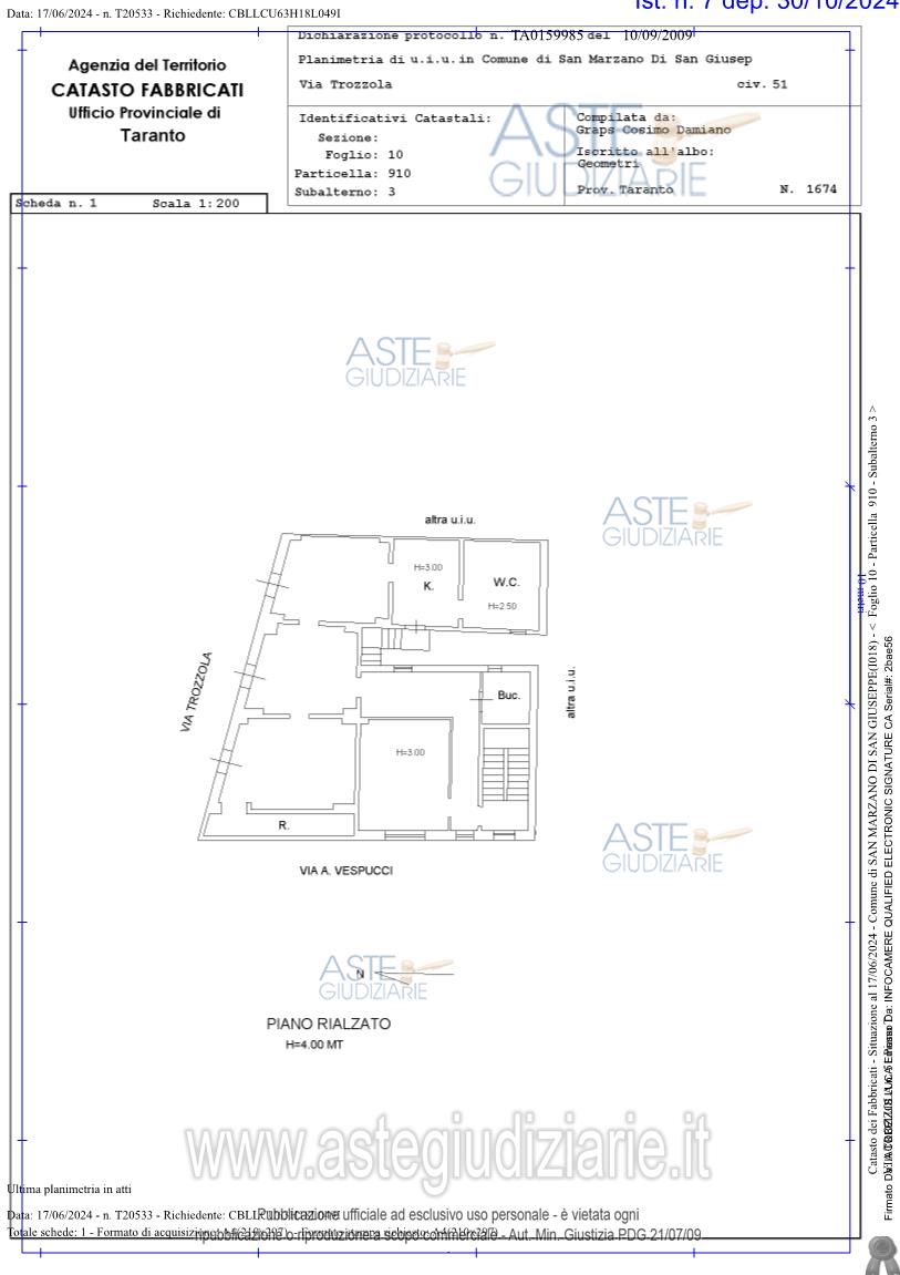 Vendita all'asta Senza incanto, con gara telematica asincrona - LOTTO 2: Piena proprietà dell’appartamento al piano terra suddiviso in due appartamenti. Prezzo base € 47.909,00 (offerta minima € 35.932,00). Data inizio operazioni di vendita: 18/03/2026 ore 16:00. Giudice Stefania D’Errico. Professionista delegato alla vendita Avv. Roberto Pugliese - Email "avv.puglieseroberto@pec.it". Custode Giudiziario Avv. Roberto Pugliese - Email "puglieseavvroby@libero.it"; Cell. 3393056250; Tel. 0994508622. Rif. Tribunale di Taranto - Contenzioso civile n. 3458/2020