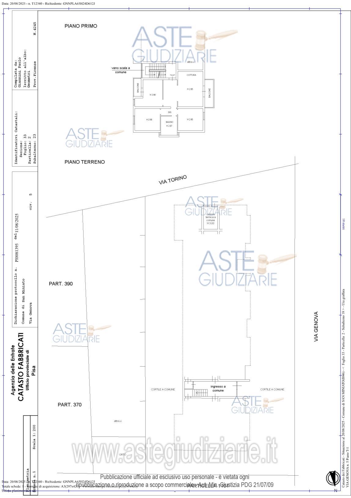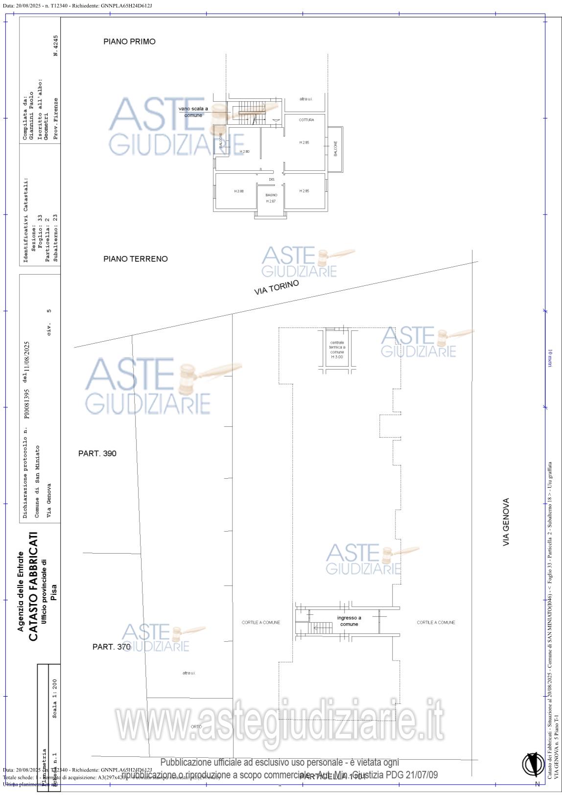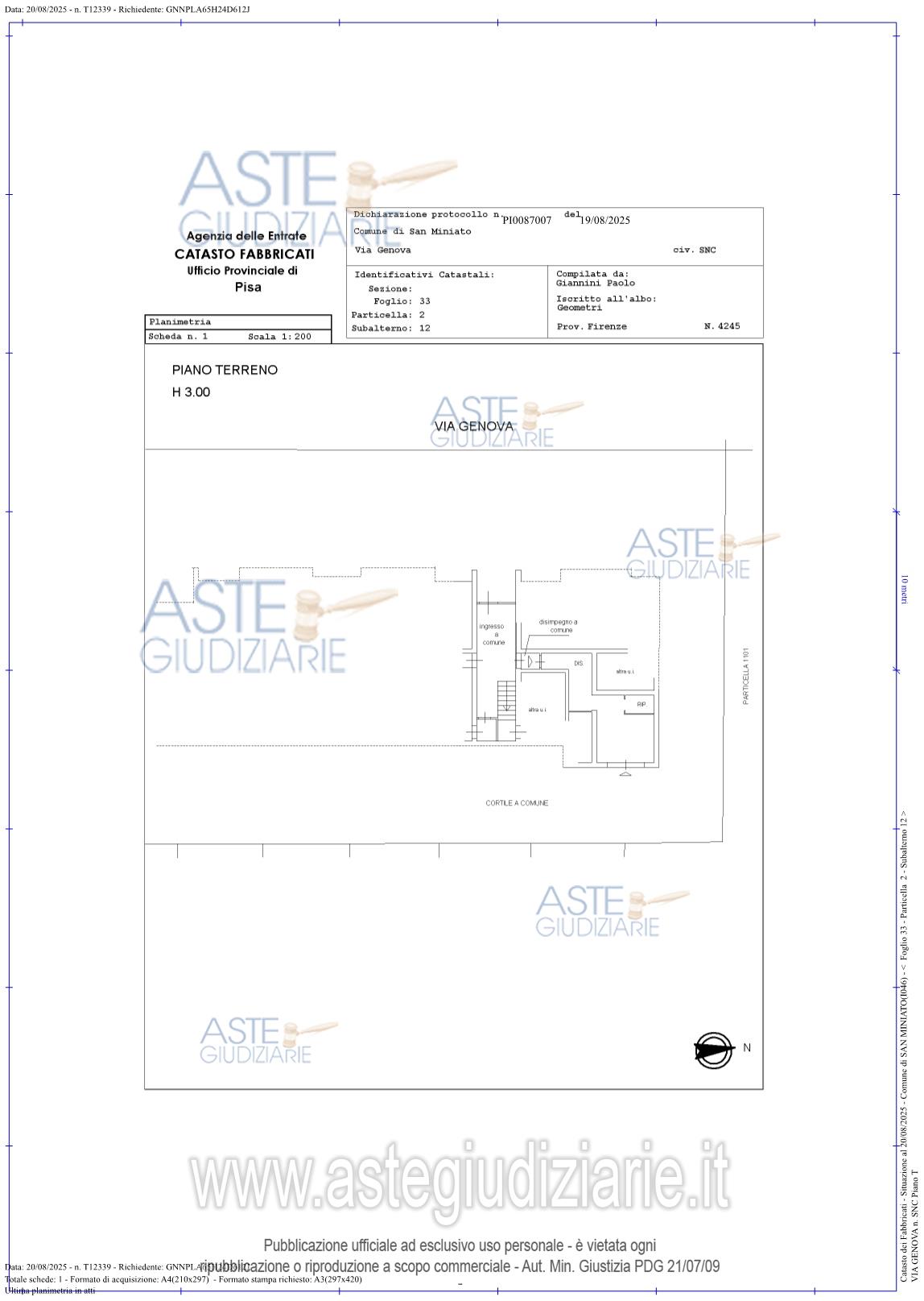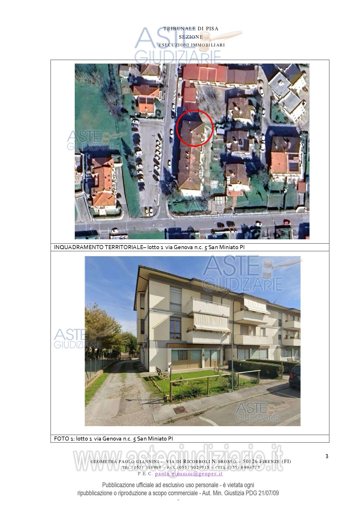Vendita all'asta Senza incanto, con gara telematica asincrona - LOTTO UNICO: Appartamento per civile abitazione posto al primo piano di un fabbricato condominiale ubicato in San Miniato, Loc. La Scala, Via Genova n. 5. Composto da: ingresso, soggiorno - pranzo con angolo cottura, disimpegno, tre camere ed un servizio igienico. E' annesso quale pertinenza esclusiva un piccolo appezzamento di terreno ortivo. E' altresì annesso un magazzino/deposito di mq 21. Prezzo base € 204.100,00 (offerta minima € 153.075,00). Data inizio operazioni di vendita: 18/06/2026 ore 14:30. Giudice Pastacaldi. Professionista delegato alla vendita Avv. Barbara Pecchia. Custode Giudiziario Dott. Cosimo Erriquez - Email "prenotazionipisa@astagiudiziaria.com". Rif. Tribunale di Pisa - Esecuzione immobiliare post legge 80 n. 38/2025