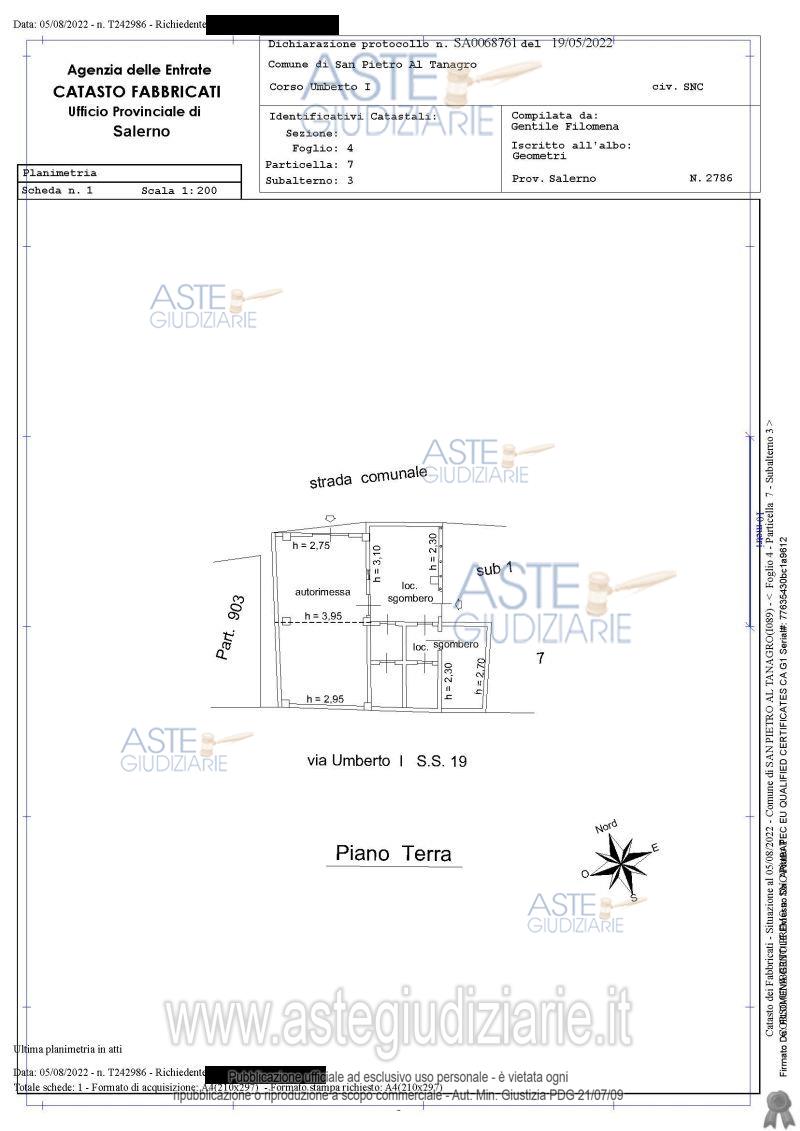 Vendita all'asta Senza incanto, con gara telematica asincrona - LOTTO UNICO: Bene N° 1:Fabbricato civile ubicato a San Pietro al Tanagro (SA) - CORSO UMBERTO I°-identificato al catasto Fabbricati - Fg. 4, Part. 7, Sub. 2, Categoria A3,cl. 3, vani 11, sup. 298 mq,- RC. € 795,34-, disposto su più livelli, a destinazione abitativa con accessori, con possibilità di accesso da due distinti ingressi. Bene N° 2 - Garage ubicato a San Pietro al Tanagro (SA) - CORSO UMBERTO I°. Identificato al catasto Fabbricati - Fg. 4, Part. 7, Sub. 3, Categoria C6, cl. 5, sup. 96,00 mq- RC € 96,58. Prezzo base € 39.918,82 (offerta minima € 29.939,10). Data inizio operazioni di vendita: 17/02/2026 ore 12:00. Professionista delegato alla vendita Avv. Barbara Pisoni - Email "studiolegalepisoni@gmail.com"; Cell. 3383615162; Tel. 097322688. Custode Giudiziario Avv. Barbara Pisoni - Email "studiolegalepisoni@gmail.com"; Cell. 3383615162; Tel. 097322688. Rif. Tribunale di Lagonegro ex Tribunale di Sala Consilina - Esecuzione immobiliare post legge 80 n. 13/2005