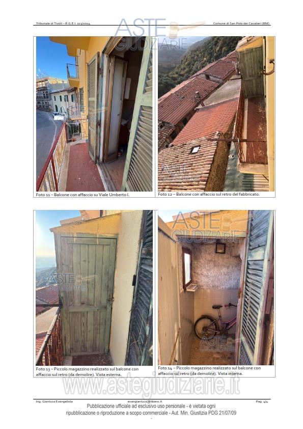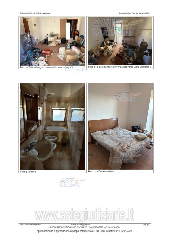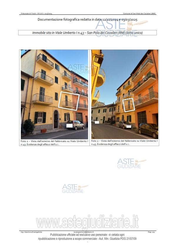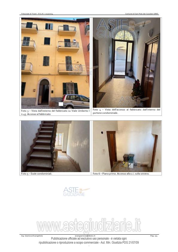 Vendita all'asta Senza incanto, con gara telematica asincrona - LOTTO UNICO: Porzione immobiliare sita nel Comune di San Polo dei Cavalieri (prov. Roma), Viale Umberto I° attualmente al civico 43 (in catasto al civico 37) e precisamente: Appartamento posto al piano primo, composto da due vani e mezzo catastali, censito nel Catasto Fabbricati del Comune di San Polo dei Cavalieri al foglio 22, part. 28, sub. 10, piano primo, Cat. A/4, cl.1, vani 2,5 rendita €.82,63. Prezzo base € 11.606,25 (offerta minima € 8.705,00). Data inizio operazioni di vendita: 31/03/2026 ore 14:00. Professionista delegato alla vendita Dott. Paola Saioni - Email "paolasaioni@studiosaioni.it"; Cell. 3381240300. Custode Giudiziario Ivg Di Roma - Email "pvp@visiteivgroma.it"; Tel. 0689569801. Rif. Tribunale di Tivoli - Esecuzione immobiliare post legge 80 n. 113/2024