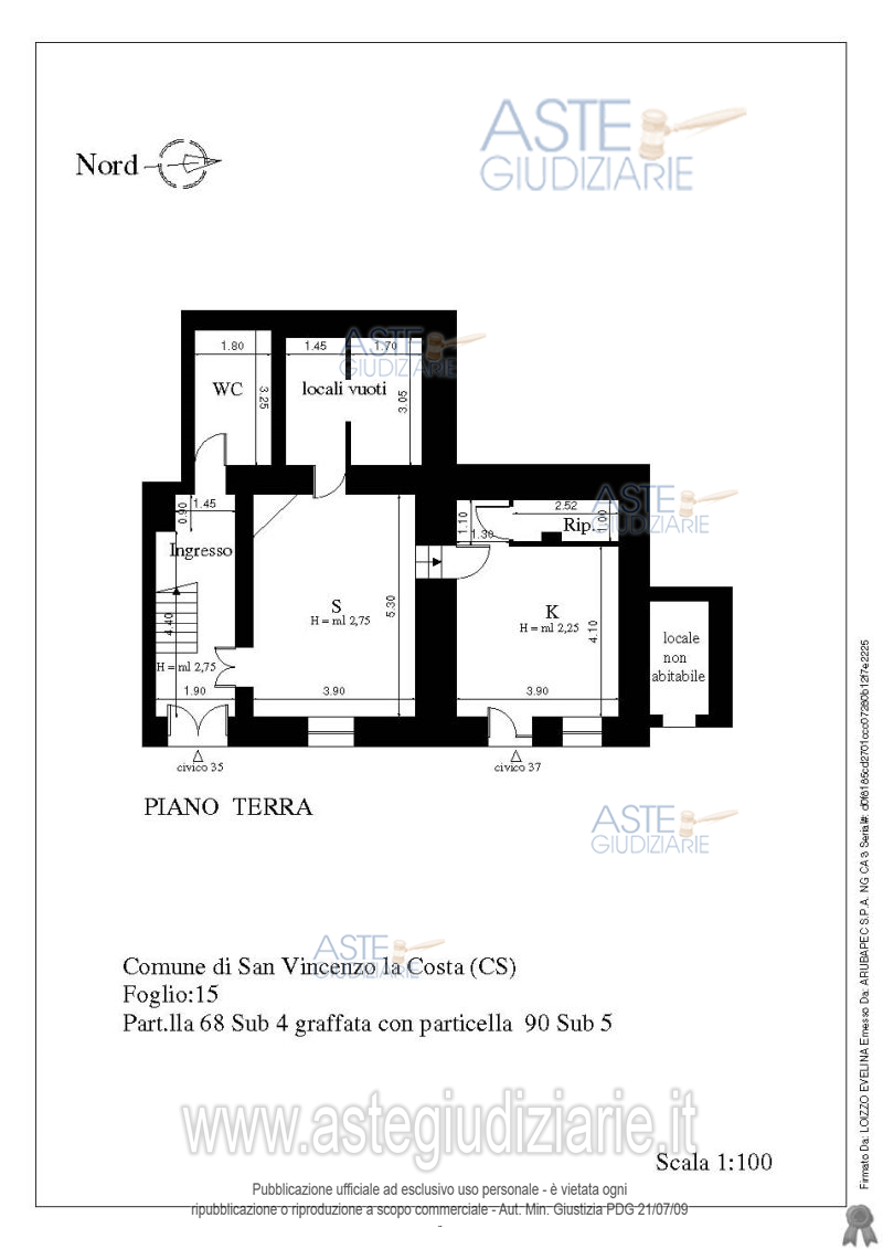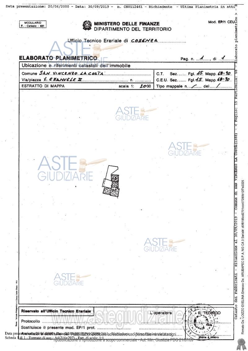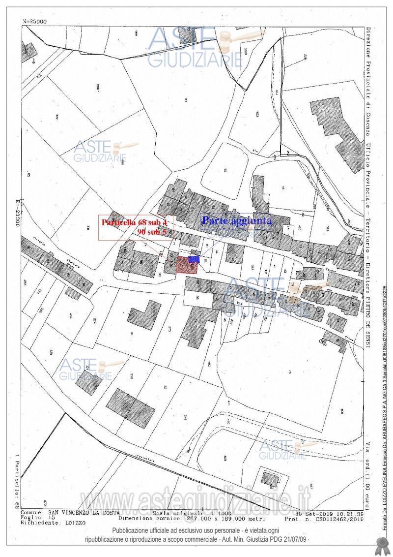 Vendita all'asta Senza incanto, con gara telematica sincrona - LOTTO UNICO: Immobile ubicato in San Vincenzo La Costa, via V. Emanuele censito catastalmente al Foglio 15 particella 68 sub 4 graffata con la P.lla 90 Sub 5 del foglio medesimo. Esso è costituito dall'intera P.lla 68 e da parte della P.lla di maggiore consistenza n. 90.confina ad est e a nord con via Vittorio Emanuele II , ad ovest con le P.lle 67 di altra proprietà, a sud con la restante parte della P.lla n.90 di altra proprietà e con la P.lla n. 70 di altra proprietà. Prezzo base € 29.152,46 (offerta minima € 26.237,22). Data vendita 10/03/2026 ore 10:00. Rif. Tribunale di Cosenza - Esecuzione immobiliare post legge 80 n. 34/2018