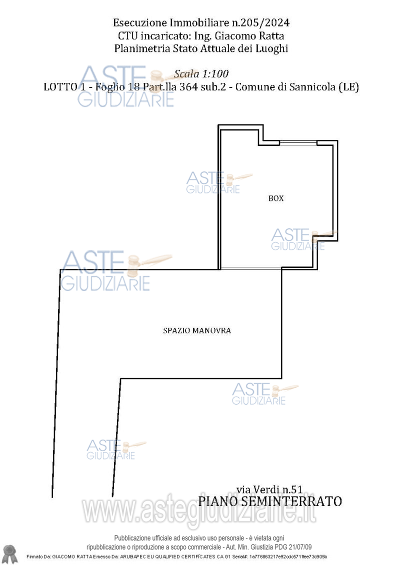 Vendita all'asta Senza incanto, con gara telematica asincrona - LOTTO 1: FABBRICATO ad uso residenziale per la PIENA PROPRIETA’ DELLA QUOTA DI 1/1, sito in SANNICOLA (LE) alla via Verdi n. 51 al Primo Piano con annesso Box al piano seminterrato (analizzato come CORPO B successivamente). Tale abitazione ricade in un complesso di 4 alloggi, con relativi box nel piano seminterrato. All’abitazione oggetto di perizia si accede per mezzo di ingresso sulla via pubblica. Prezzo base € 41.103,00 (offerta minima € 30.828,00). Data inizio operazioni di vendita: 26/03/2026 ore 11:00. Giudice Antonio Barbetta. Professionista delegato alla vendita Dott. Nadia Arnesano - Email "nadiaarnesanolecce@gmail.com"; Cell. 3299713982. Custode Giudiziario Dott. Nadia Arnesano - Email "nadiaarnesanolecce@gmail.com"; Cell. 3299713982. Rif. Tribunale di Lecce - Espropriazione immobiliare (cartabia) n. 205/2024