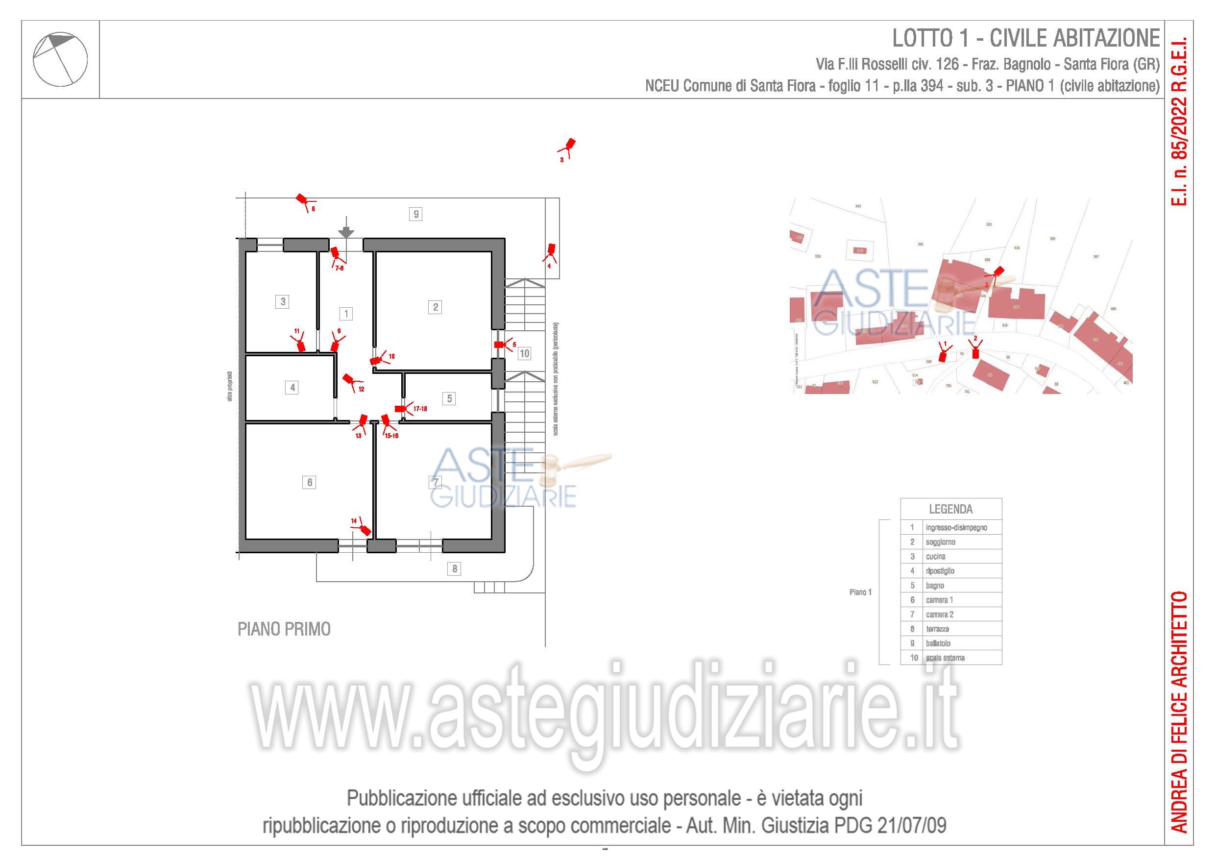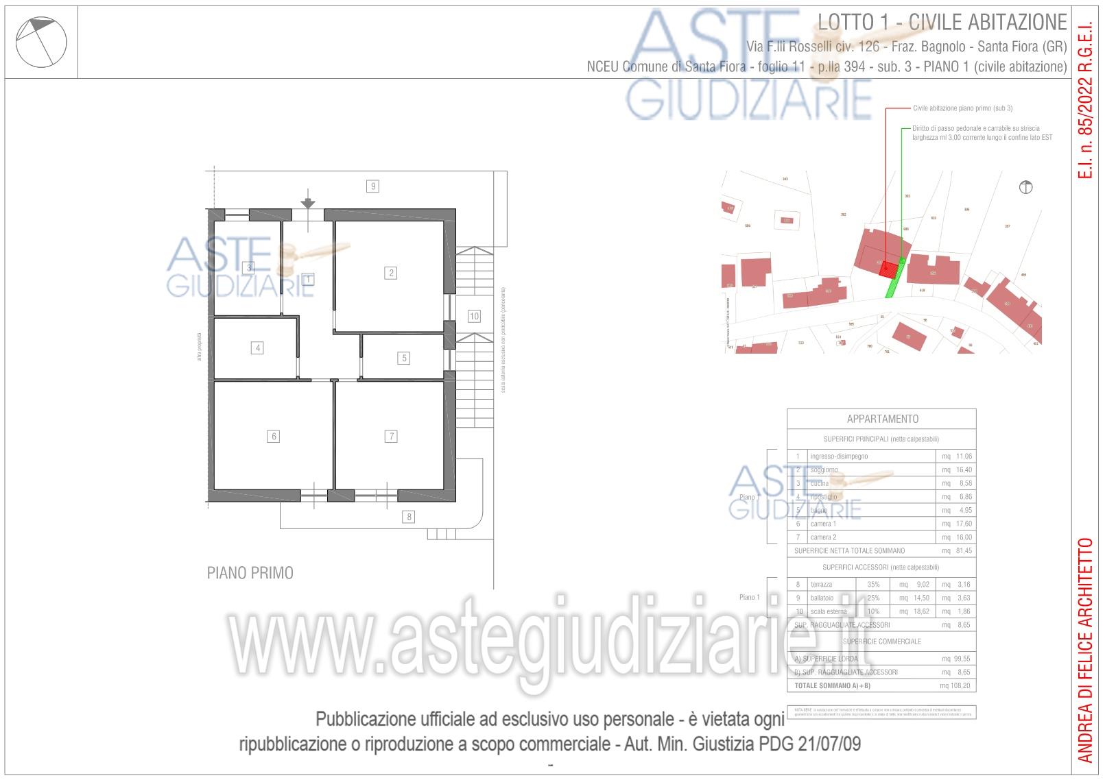 Vendita all'asta Senza incanto, con gara telematica asincrona - LOTTO 1: PIENA PROPRIETÀ DELL’INTERO di CIVILE ABITAZIONE, posta in Via F.lli Rosselli n. 126 – fraz. Bagnolo – Santa Fiora (GR),NCEU Comune di Santa Fiora: foglio 11, p.lla 394, sub 3, cat. A4, classe 3, vani 5 - rendita € 232,41 – PIANO 1 - COMPOSTA DA ingresso-disimpegno, soggiorno, cucina, camera 1, camera 2, bagno, ripostiglio, il tutto per mq. 81,45 ca. di superficie netta calpestabile ed è accessoriata di terrazza per mq 9,02 ca. e ballatoio per mq 14,50 ca. Prezzo base € 35.360,00 (offerta minima € 26.520,00). Data inizio operazioni di vendita: 24/03/2026 ore 10:30. Giudice Dott. Cristina Nicolo'. Custode Giudiziario Avv. Pierfrancesco Rechichic - Email "pfrechichi@gmail.com"; Cell. 335226364. Rif. Tribunale di Grosseto - Esecuzione immobiliare post legge 80 n. 85/2022