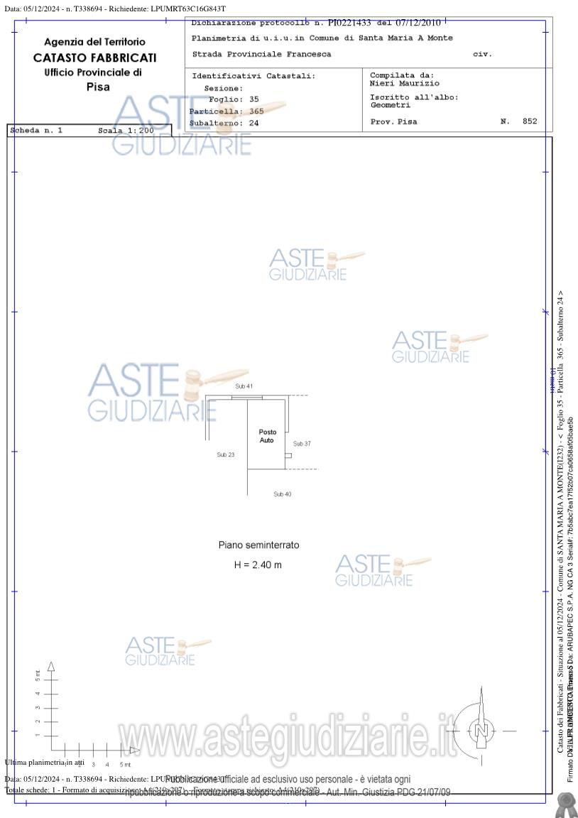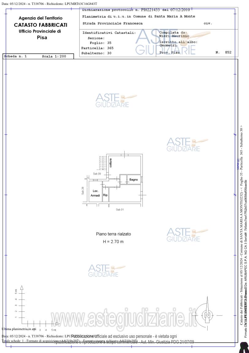 Vendita all'asta Senza incanto, con gara telematica asincrona - LOTTO 1: Il lotto 1 è composto da: a) appartamento sito a Santa Maria a Monte (PI), Via Provinciale Francesca, piano rialzato, lato nord-est, composto da soggiorno-pranzo angolo cottura, disimpegno, camera, locale armadi, bagno con antibagno e ripostiglio (bene n. 1); b) posto auto sito a Santa Maria a Monte (PI), Via Provinciale Francesca, piano seminterrato, lato nord-ovest (bene n. 7). Tale lotto è uno dei sei lotti facenti parte di un più ampio fabbricato, tutti all'asta mediante la presente procedura es. imm. Prezzo base € 92.000,00 (offerta minima € 69.000,00). Data inizio operazioni di vendita: 26/02/2026 ore 10:00. Professionista delegato alla vendita Avv. Gaetano Toscano - Email "g.toscano@studio.bartalena.net"; Tel. 05045146. Custode Giudiziario Francesco Casella - Email "ivgpisa@astagiudiziaria.com"; Tel. 050554790. Rif. Tribunale di Pisa - Espropriazione immobiliare (cartabia) n. 144/2024