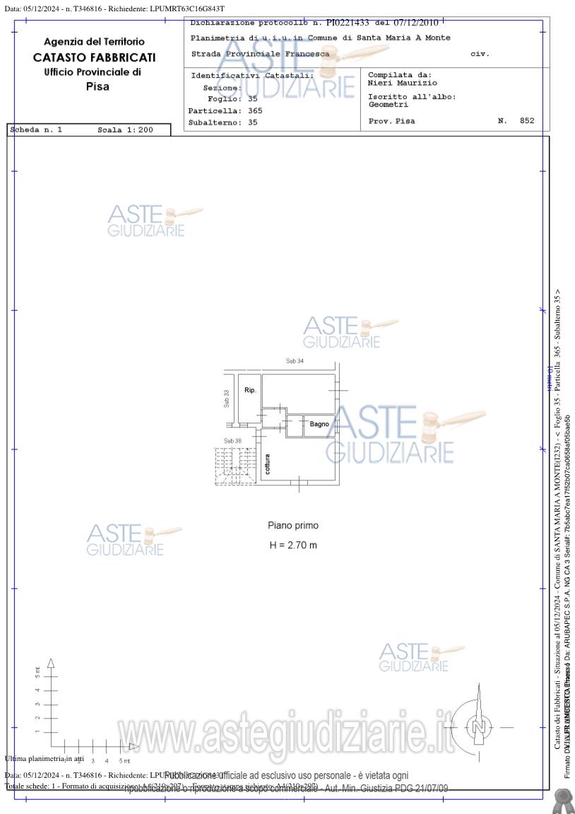 Vendita all'asta Senza incanto, con gara telematica asincrona - LOTTO 5: Il lotto 5 è composto da: a) appartamento sito a Santa Maria a Monte (PI), Via Provinciale Francesca, piano primo, lato sud-est, composto da soggiorno-pranzo angolo cottura, disimpegno, camera, bagno con antibagno e ripostiglio (bene n. 5); b) posto auto sito a Santa Maria a Monte (PI), Via Provinciale Francesca, piano seminterrato, lato sud-est (bene n. 10). Tale lotto è uno dei sei lotti facenti parte di un più ampio fabbricato, tutti all'asta mediante la presente procedura es. imm. Prezzo base € 84.000,00 (offerta minima € 63.000,00). Data inizio operazioni di vendita: 26/02/2026 ore 10:00. Professionista delegato alla vendita Avv. Gaetano Toscano - Email "g.toscano@studio.bartalena.net"; Tel. 05045146. Custode Giudiziario Francesco Casella - Email "ivgpisa@astagiudiziaria.com"; Tel. 050554790. Rif. Tribunale di Pisa - Espropriazione immobiliare (cartabia) n. 144/2024