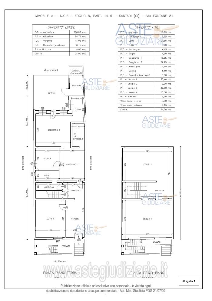 Vendita all'asta Senza incanto - LOTTO 1: Quota pari a 1/1 del diritto di proprietà su unità immobiliare ad uso civile abitazione, sita in Comune di Santadi, Via Fontane n. 81, piano terra e primo piano (nella visura catastale aggiornata al 22/11/2023 è indicato il civico n.63) identificata al Catasto Fabbricati del Comune di Santadi alla Sezione Urbana E, Foglio 5, Particella 1416, Cat. A/2, Classe 4, Vani 10, rendita catastale € 506,13. Prezzo base € 48.018,64 (offerta minima € 36.013,98). Data vendita 02/12/2025 ore 15:00. Giudice Dott. Valentina Frongia. Professionista delegato alla vendita Rag. Maria Gabriella Curto - Email "curtogabri@tiscali.it"; Tel. 0702058710. Rif. Tribunale di Cagliari - Esecuzione immobiliare post legge 80 n. 285/2012